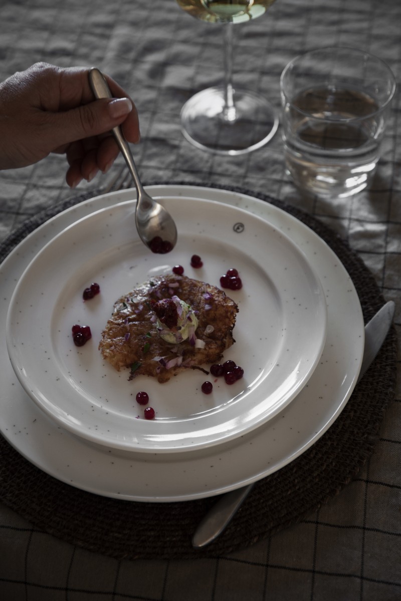 ERNST stærri diskur úr postulíni er hluti af stærri seríu með nokkrum mismunandi hlutum eins og smádisk, disk og öllum hlutum fyrir notalega kaffitíma. Fallegur hvítur gljái með keim af litlum doppum. Gerir matarupplifunina mjög skemmtilega.
