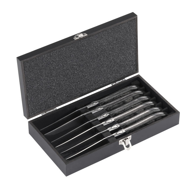 Luxury steikarhnífasett sem inniheldur inniheldur 6 steikarhnífa. Stílhreinir hnífar með glæsilegt svart handfang úr ebony og 11,3cm ryðfrítt stálblað sem sker auðveldlega í gegnum kjöt. Steikarhnífarnir koma í fallegri viðaröskju sem er svört á litinn.