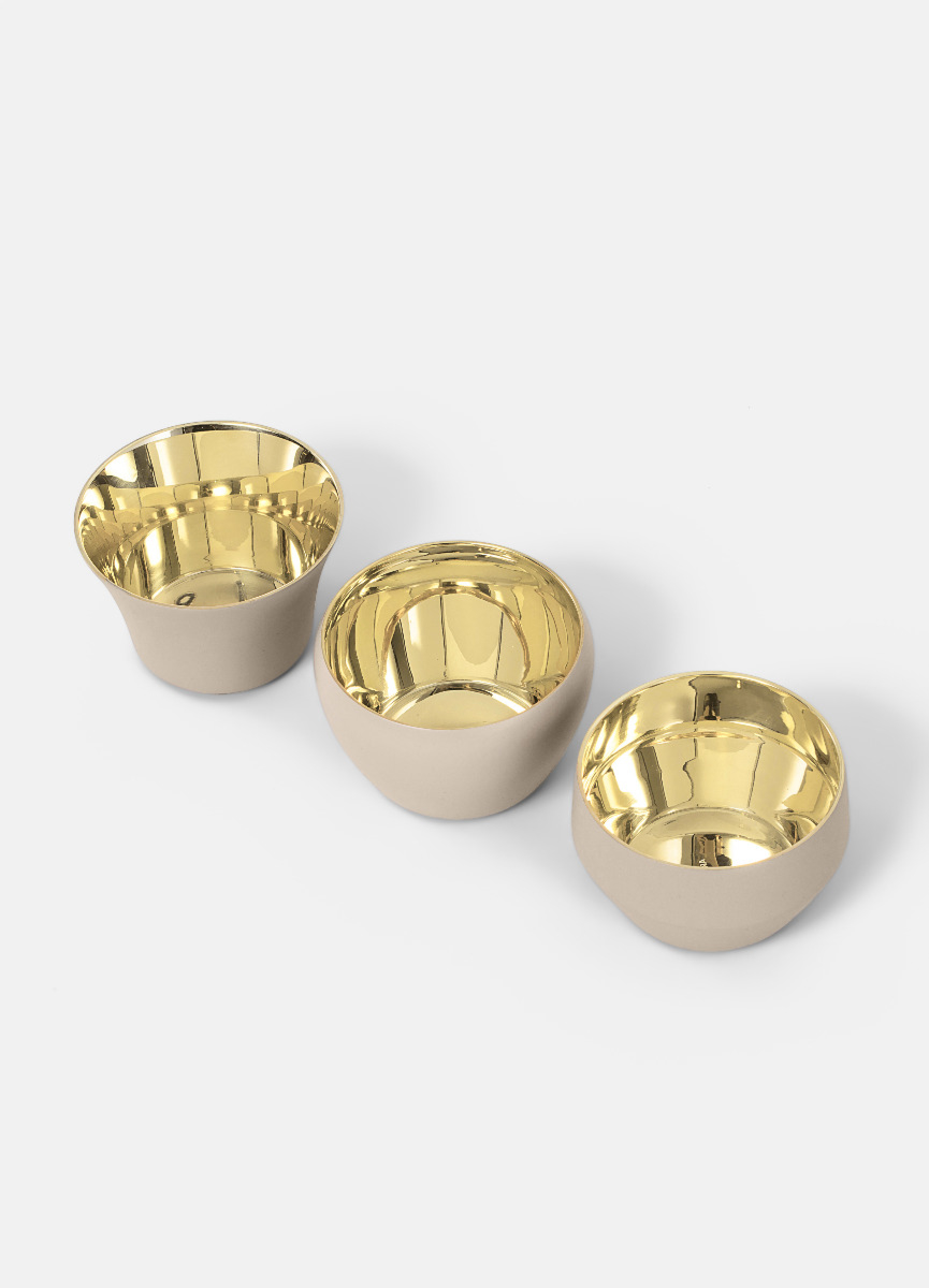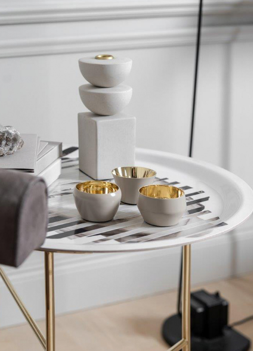 Kin is a tea light candle holder with five different models designed by the internationally successful design studio Claesson Koivisto Rune. The exterior of this design has white powder coating, the interior is made of polished brass. Designed 2010. Care instructions: Do not move the tealight when lit. Put out the tealight by suffocating it. Only use tealights from well-known producers and of high quality. Do not place tealights on flammable or delicate surfaces. Do not place near flammable materials.