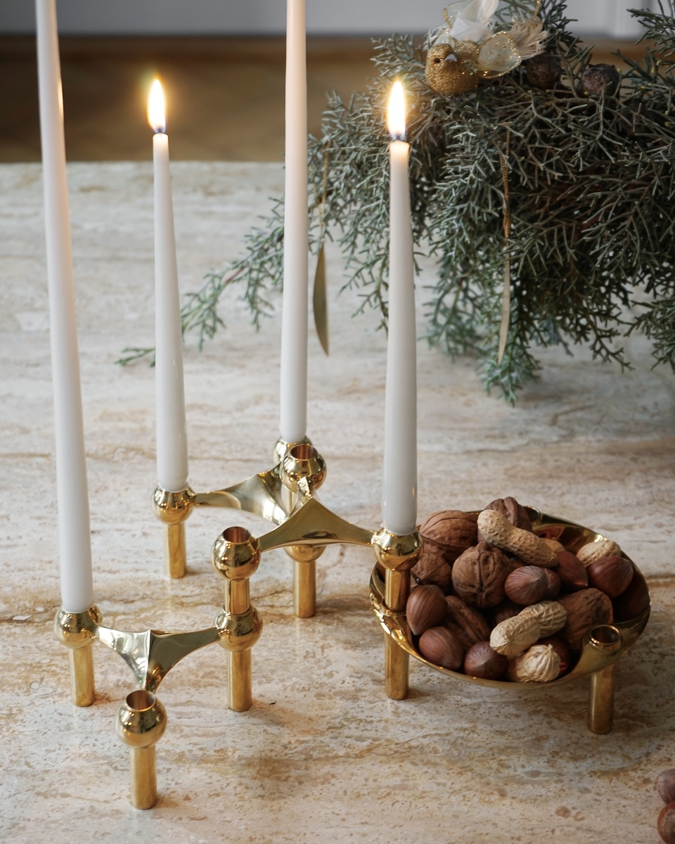 The solid brass bowl is one of the latest relaunches in the Stoff Nagel collection. Back in the 1960s, when the bowl first saw the light of day, it was designed as an ashtray, but today it has several other design features. It invites you to be even more creative by combining it with other Stoff Nagel designs and adding taper candles. Fill it with seasonal decorations such as Easter eggs or small necessities or leave it empty for a simple and clean look.
