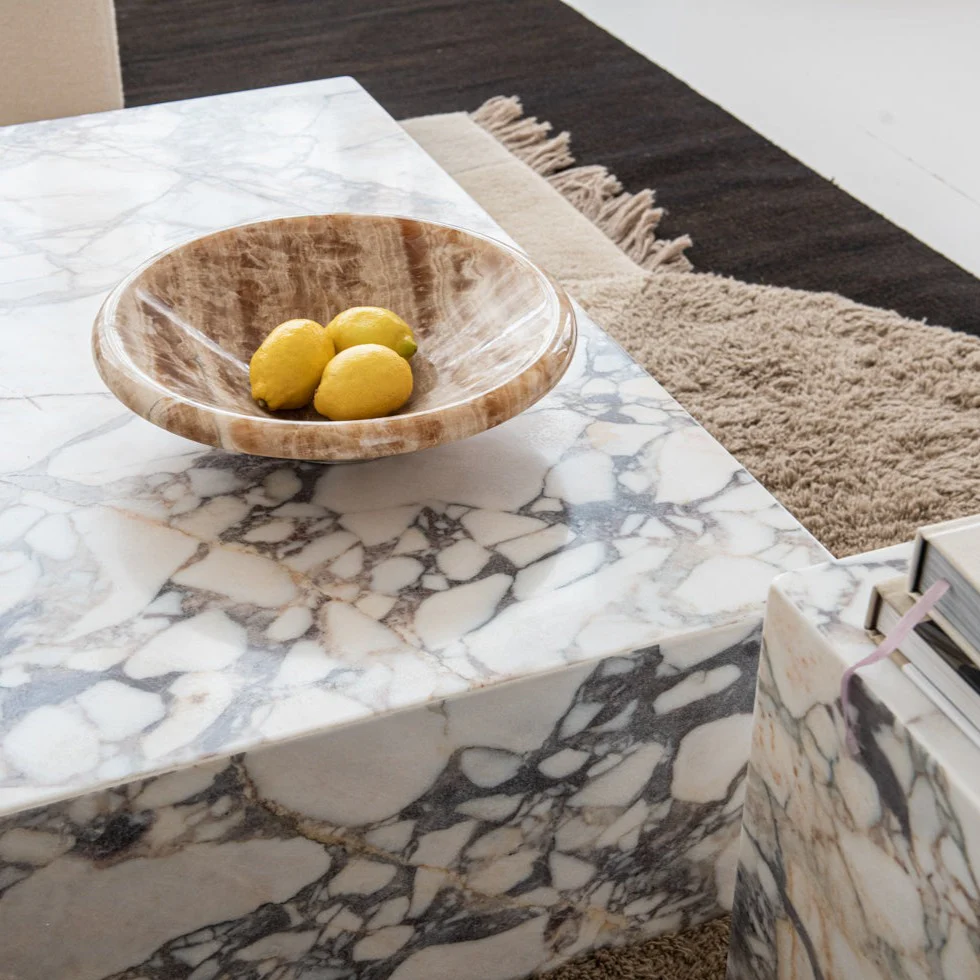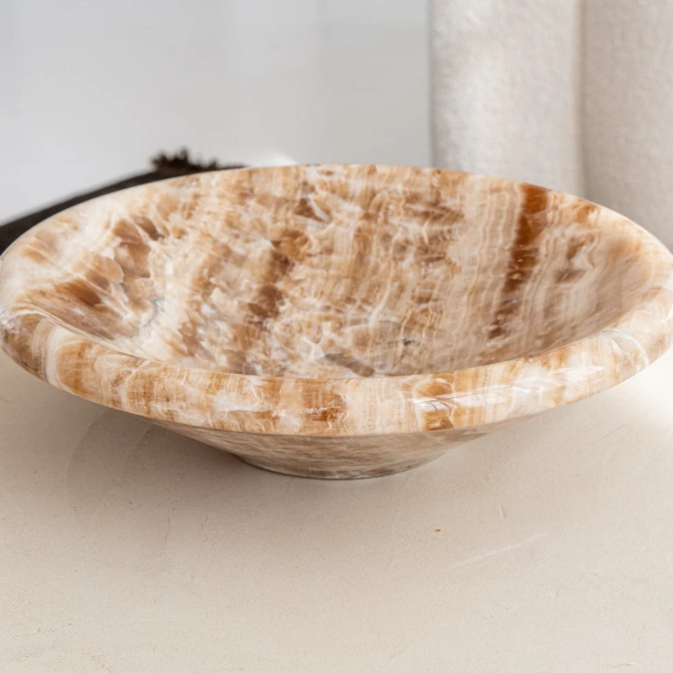 Þessi skál er unnin úr stórkostlegu brúnu onyxi og felur í sér fágaðan lúxus og náttúrufegurð. Ríkir jarðlitir og sláandi æðar skapa tilfinningu fyrir dýpt og hlýju, sem gerir það að sannkölluðu yfirlýsingu.