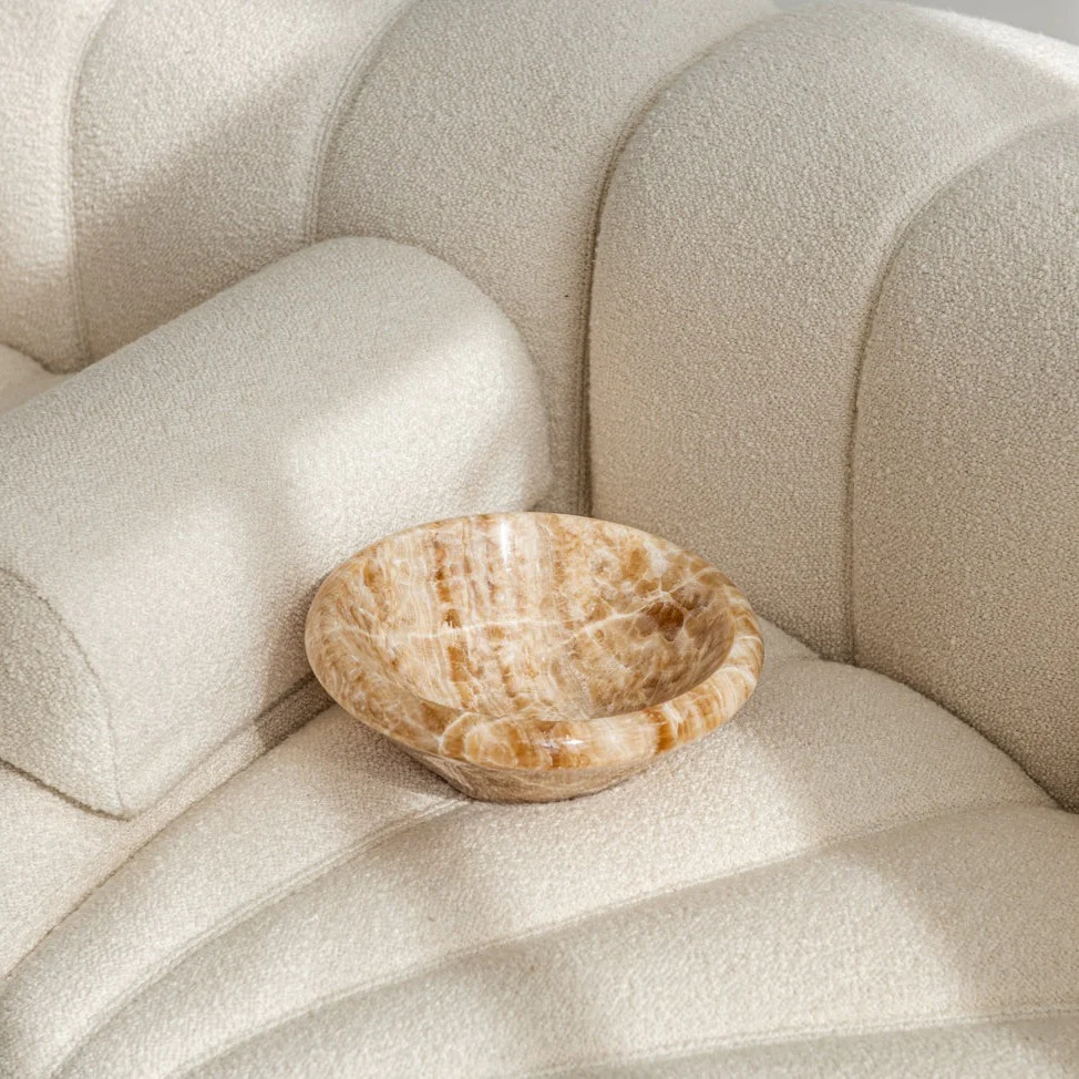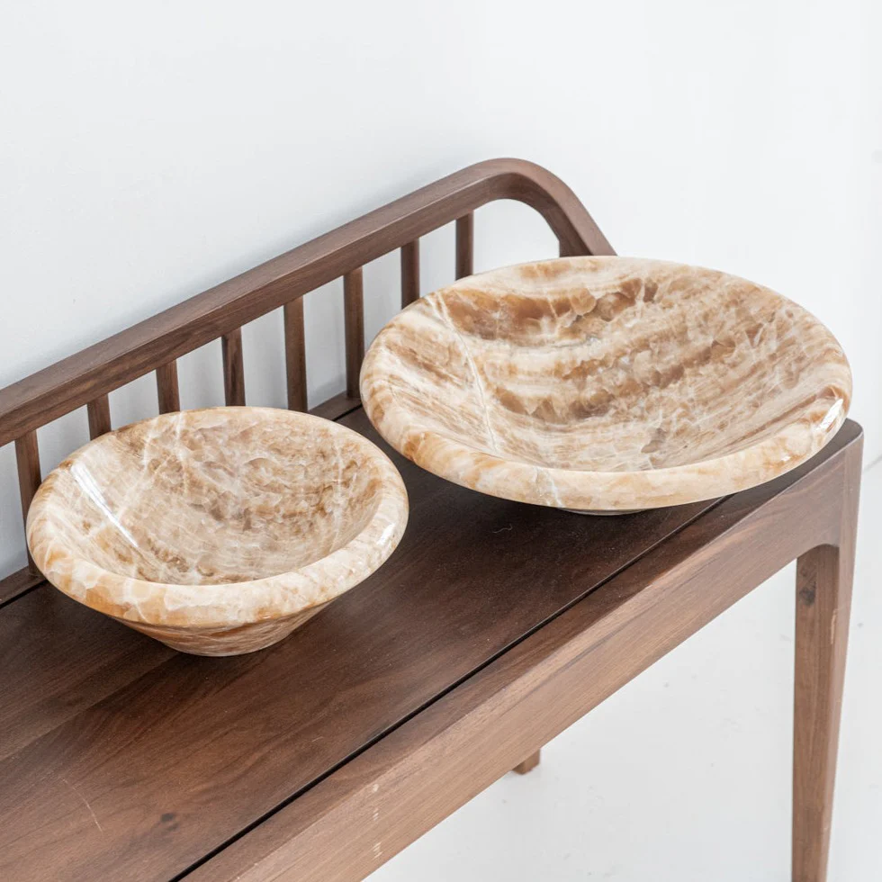 Þessi skál er unnin úr stórkostlegu brúnu onyxi og felur í sér fágaðan lúxus og náttúrufegurð. Ríkir jarðlitir og sláandi æðar skapa tilfinningu fyrir dýpt og hlýju, sem gerir það að sannkölluðu yfirlýsingu.