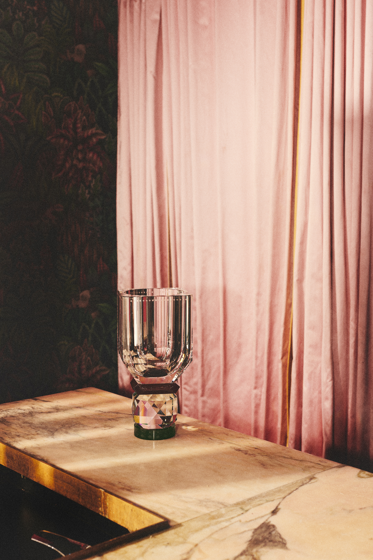 Utah vasinn endurómar Art Deco áhrif hönnuðanna með hreinum, rúmfræðilegum línum. Hann er gerður úr hágæða handskornum kristöllum, með gimsteinalíkum flötum brúnum sem gefa vasanum ljómandi áhrif. Settu þennan vasa á bjartan stað og sjáðu hvernig sólarljósið dreist mjúkt og glitrandi um umhverfið.