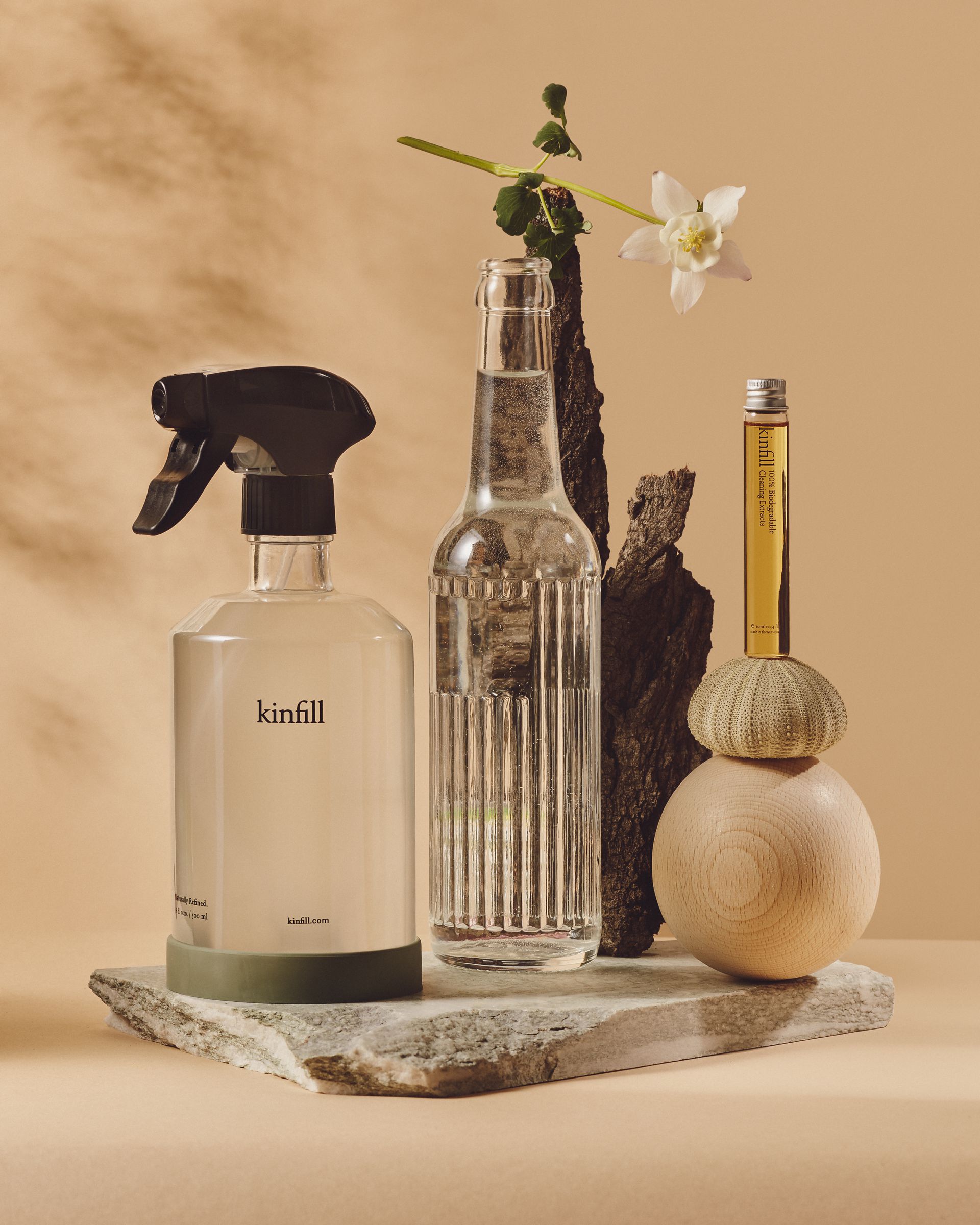 Kinfill hefur hannað fallegar hreingerningarvörur sem hjálpa til við að umbreyta þessum venjum. 100% niðurbrjótanlegt hreinsiefni, sem blandast við vatnið úr krananum þínum. Blandan geymist í fallegum ítölskum glerflöskum sem nota má aftur og aftur.
