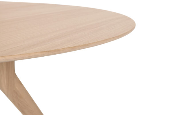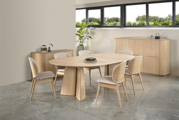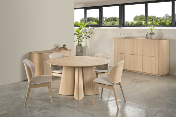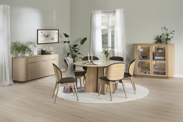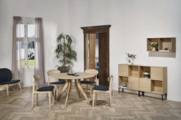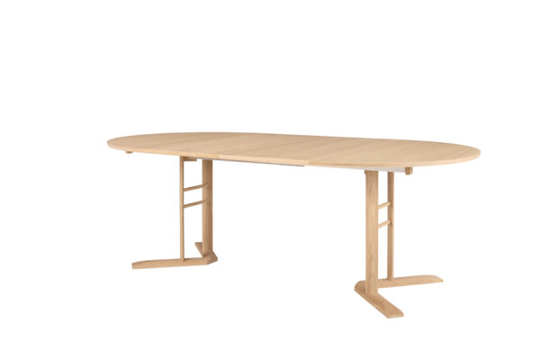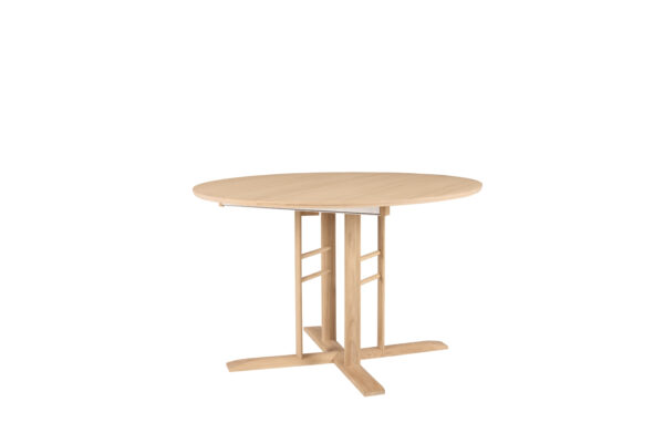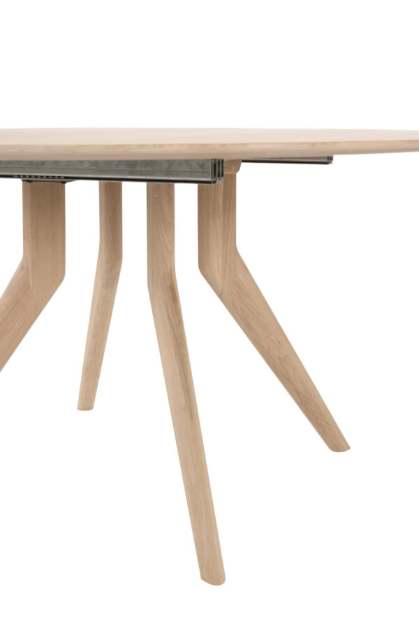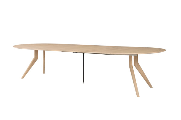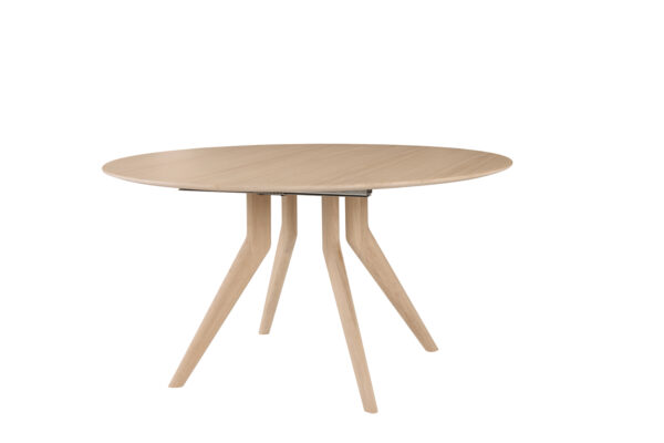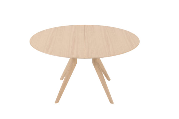 The round Malli table has a centre leg that gives it a nice modern look. When the table is extended, the base divides into two halves, giving the table a striking new look.