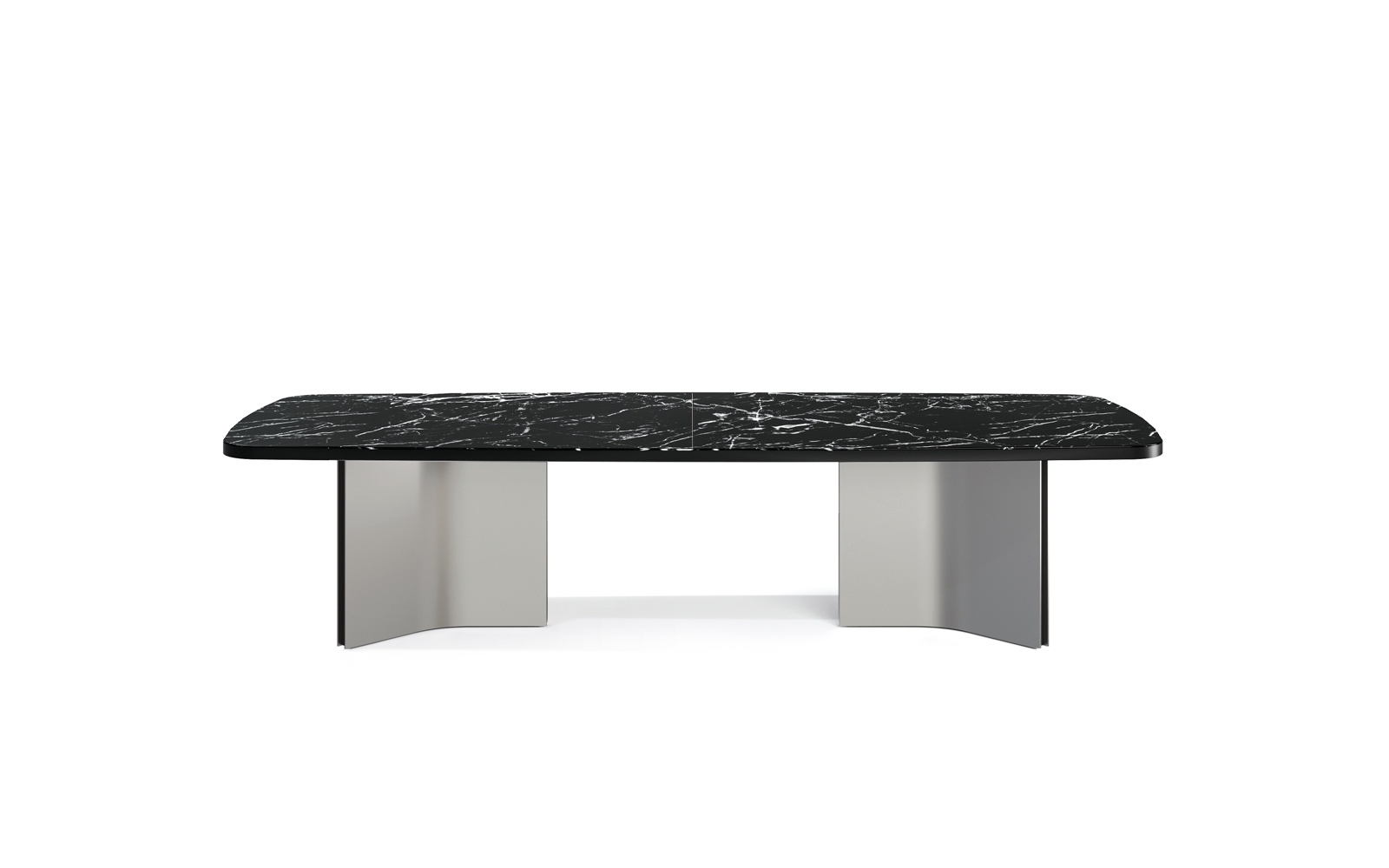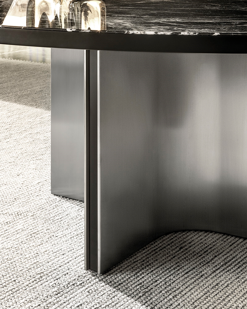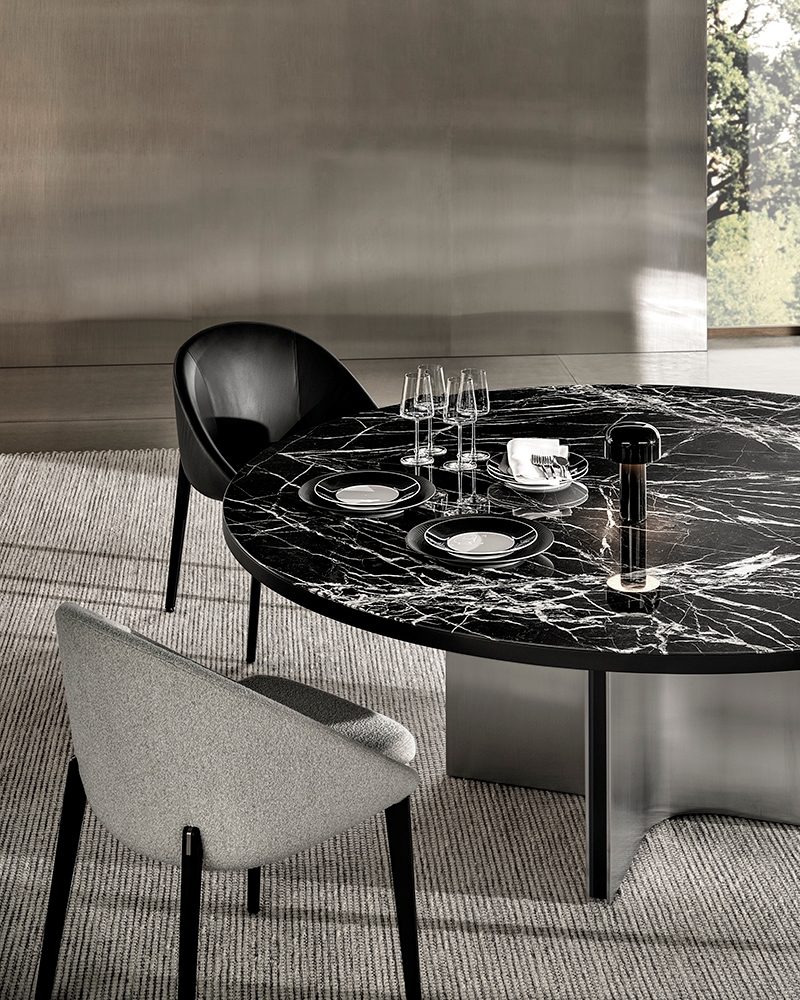 With its bold, sculptural-shaped base, which draws a series of quarter circles, illuminated by the glints of the metal, and interspersed with a black insert, the Marvin table makes an impressive impact and is characterised by great versatility. It is part of a wide variety of dining tables with a clearly architectural inspiration, featuring bases in satin finish stainless steel or in Pewter-coloured varnished metal.