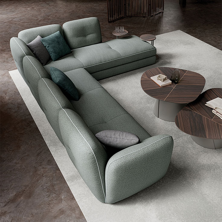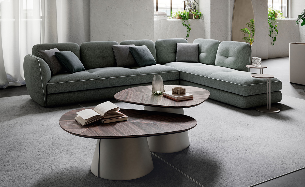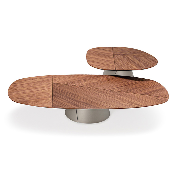 Coffe table with base in titanium or bronze embossed lacquered steel. Top with belleved edges in Canaletto walnut with details in burned oak or burned oak with details in Canaletto walnut.