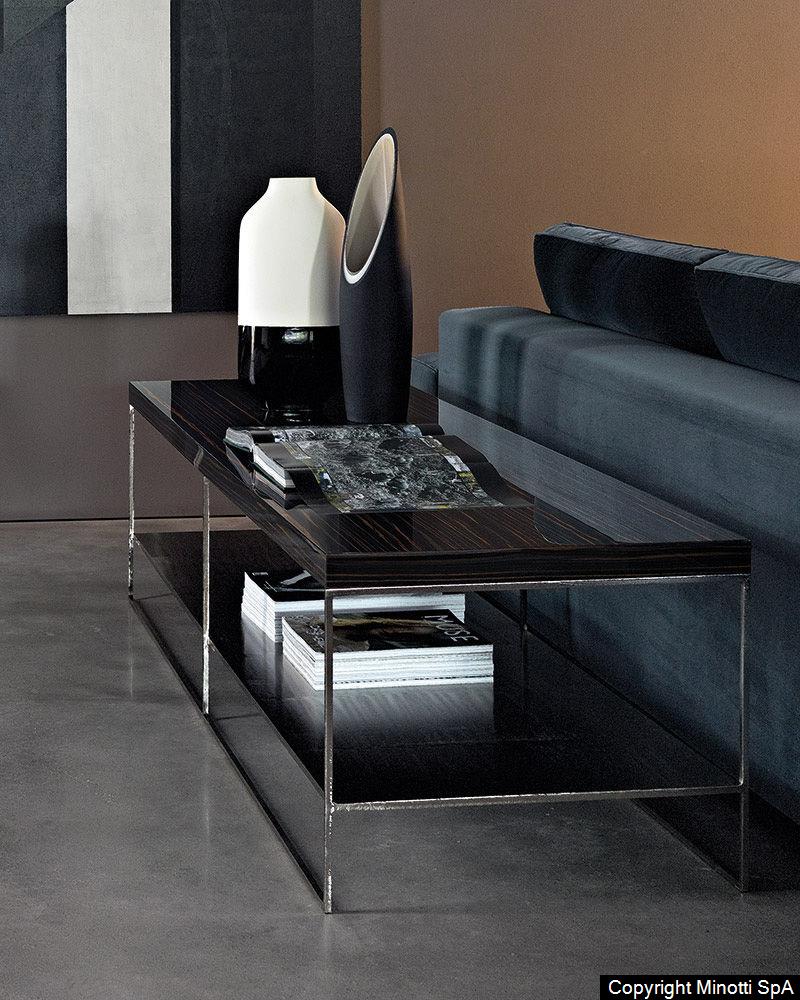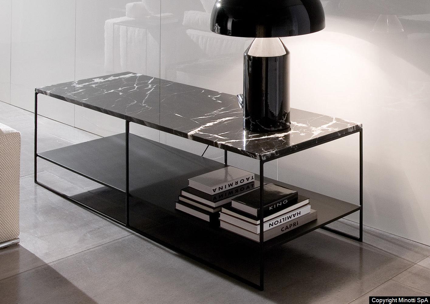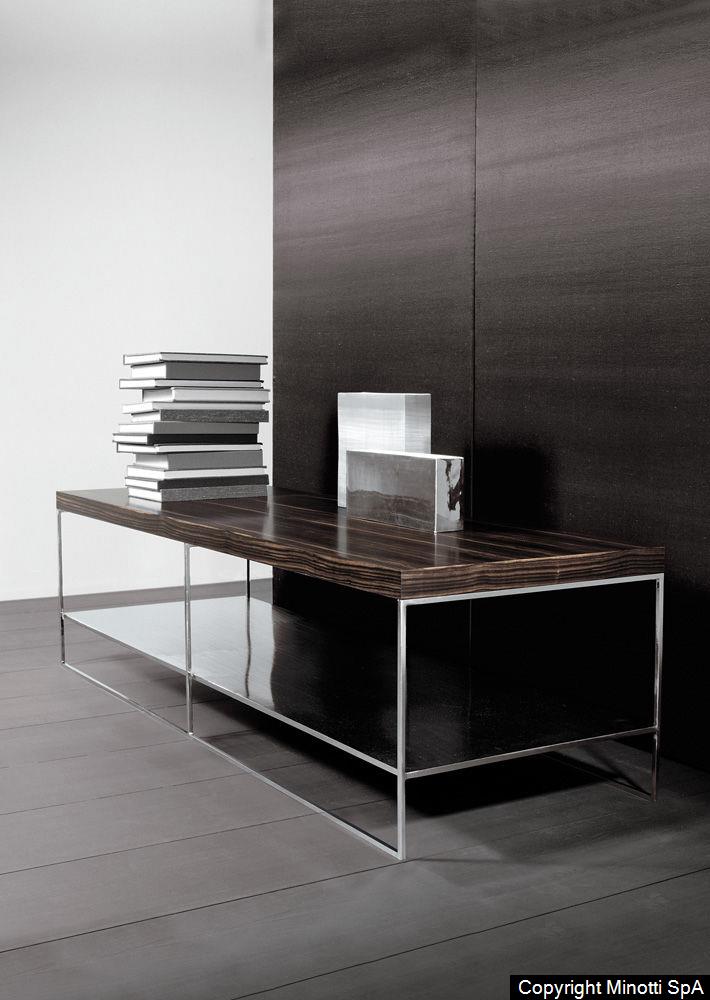 The hand-crafted or matt black solid iron structure can be teamed with the following tops: ebony veneer with a matt or glossy clear polyester finish, natural brushed oak, open pore Grey, Moka or Black tinted oak, lacquered in a variety of refined nuances and Black Marquina marble.