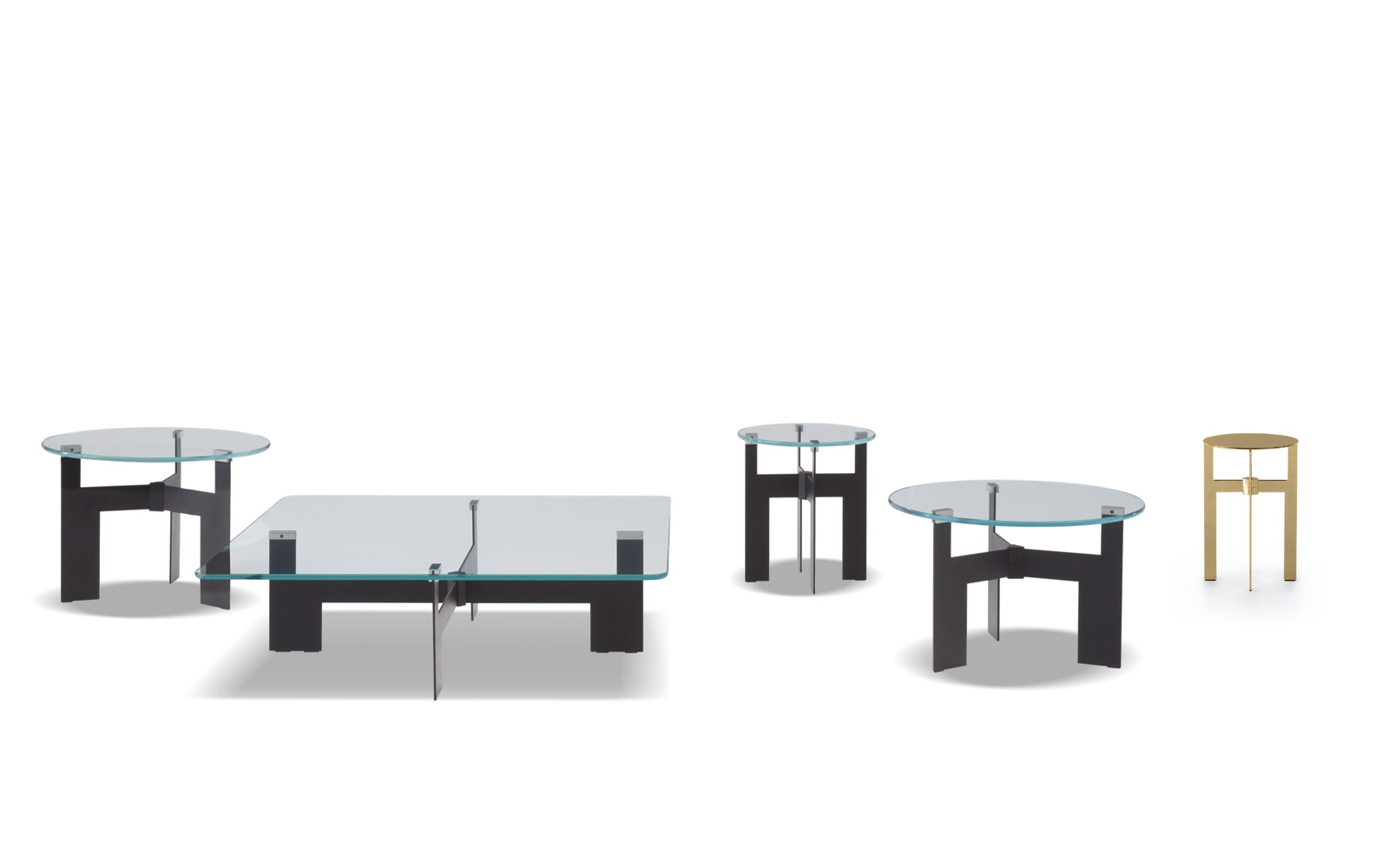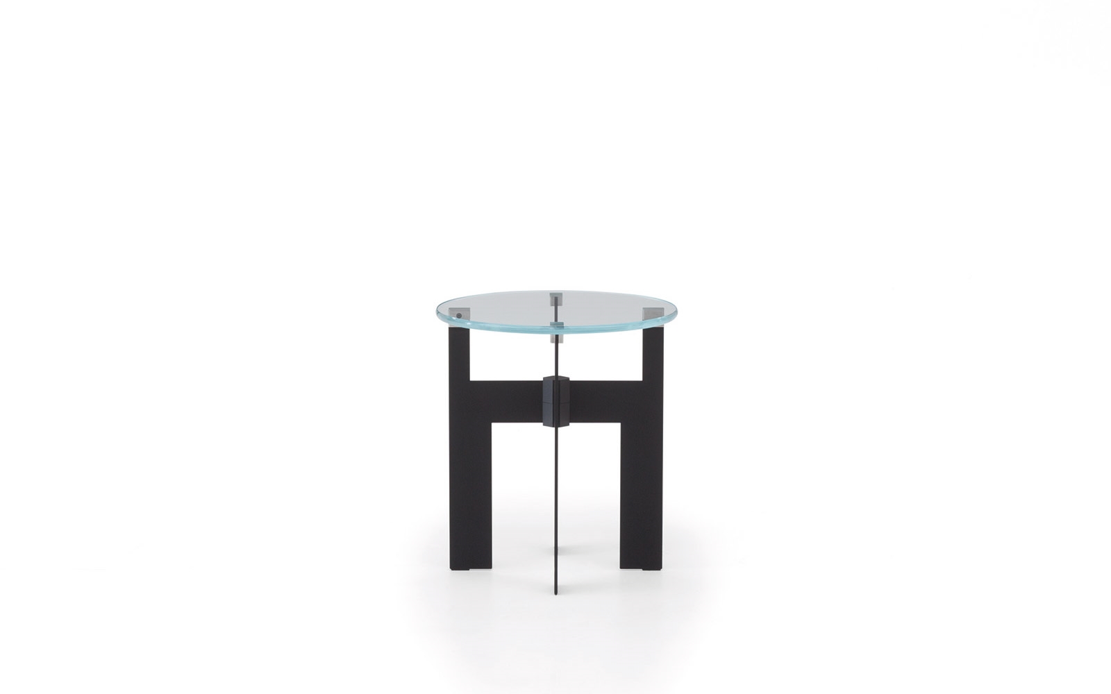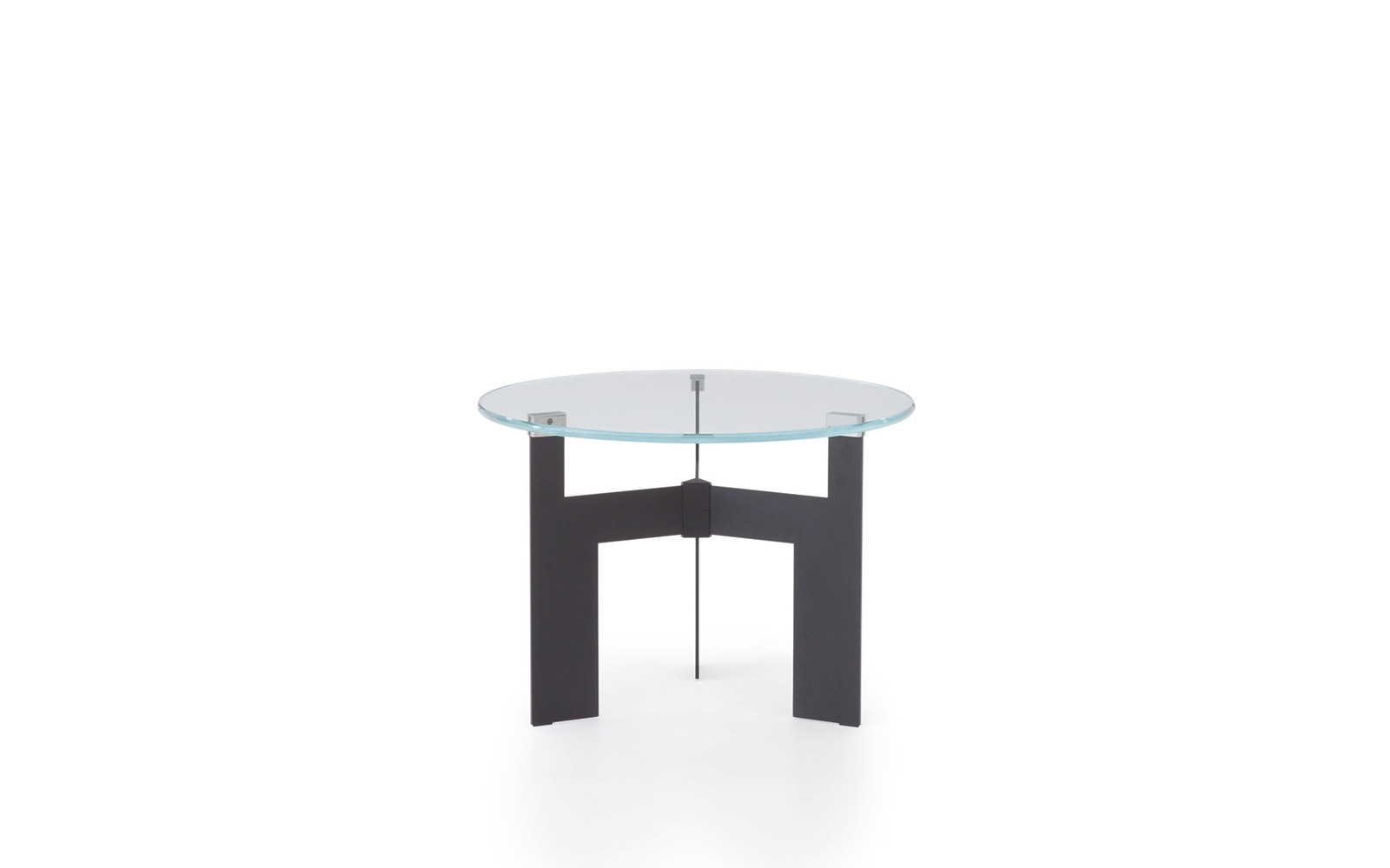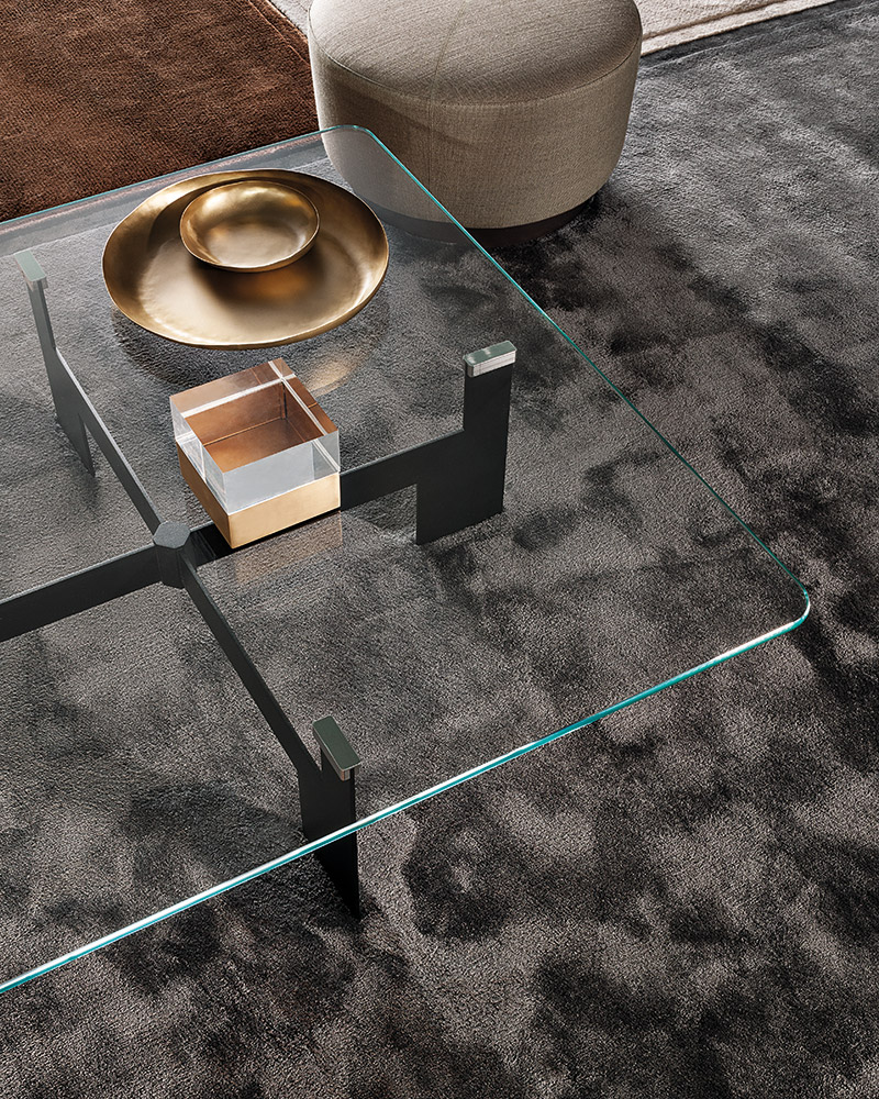 The tops in extra-clear glass or Smoked Grey glass with rounded edge draw attention to the design of the metal base with embossed Black painted finish.