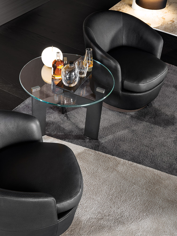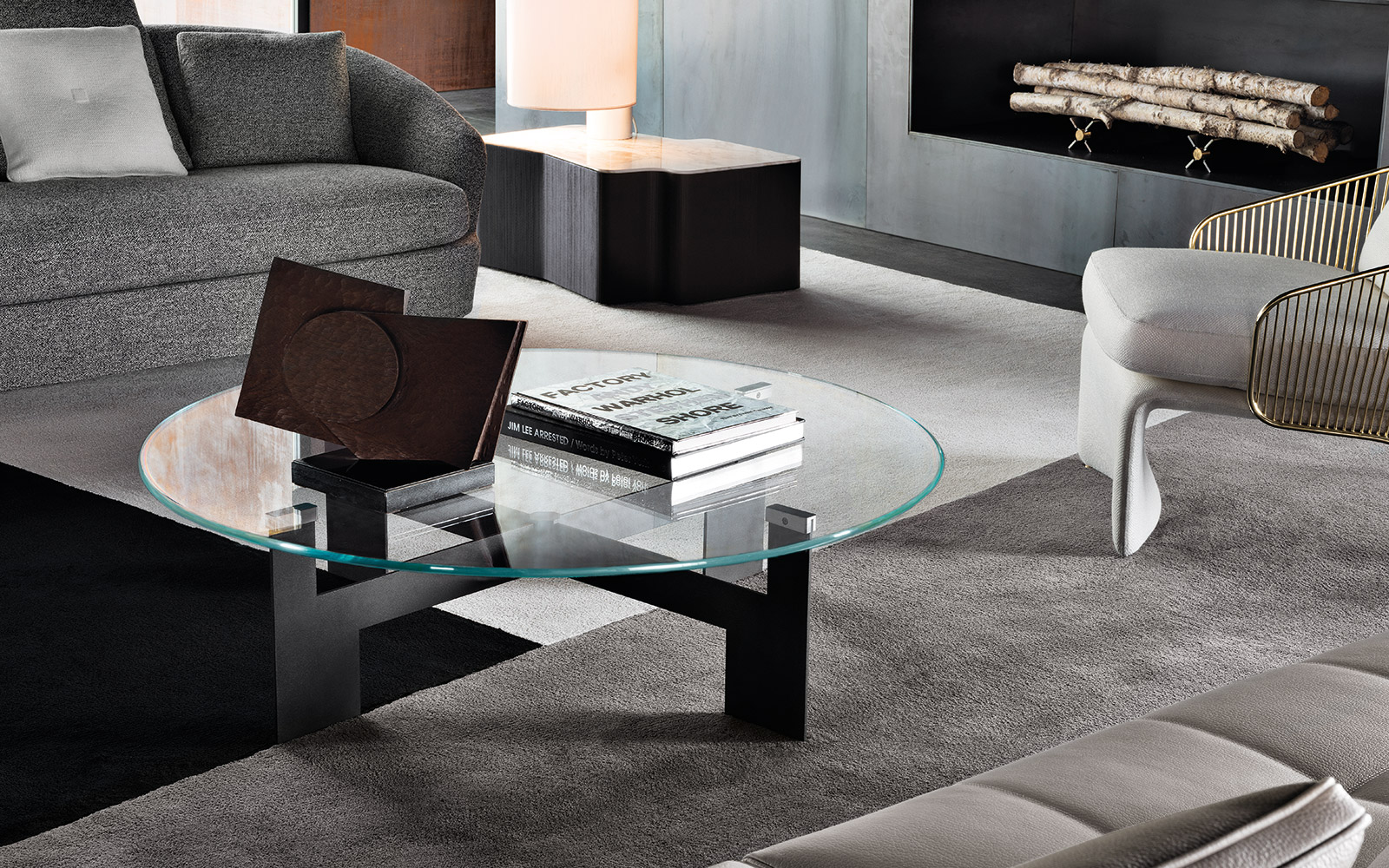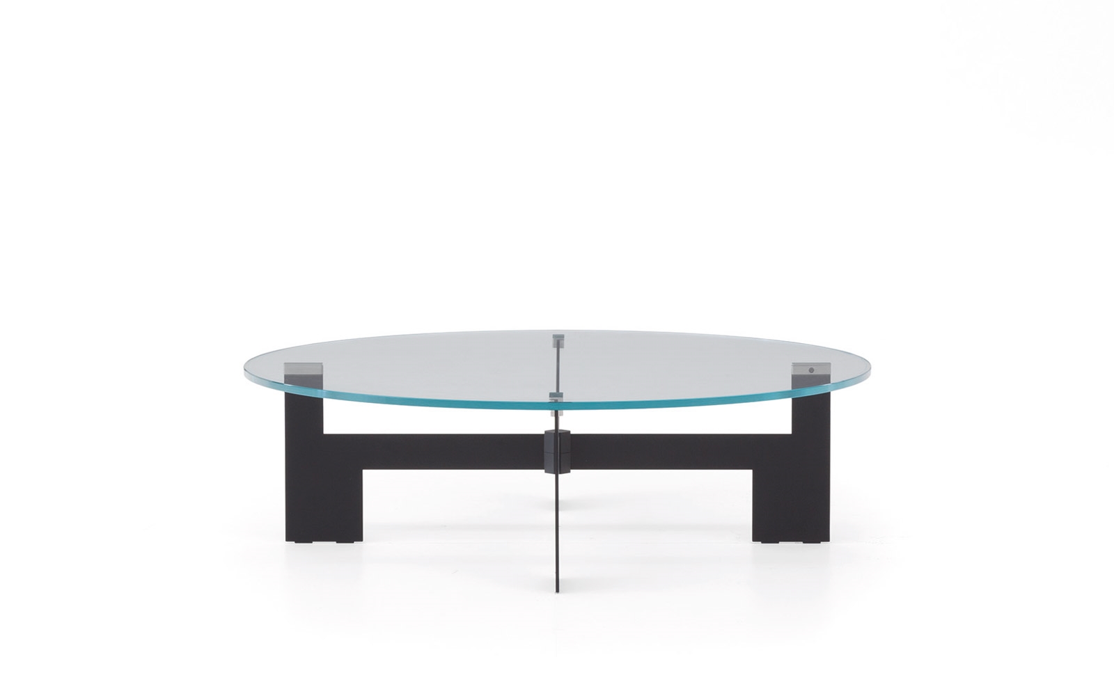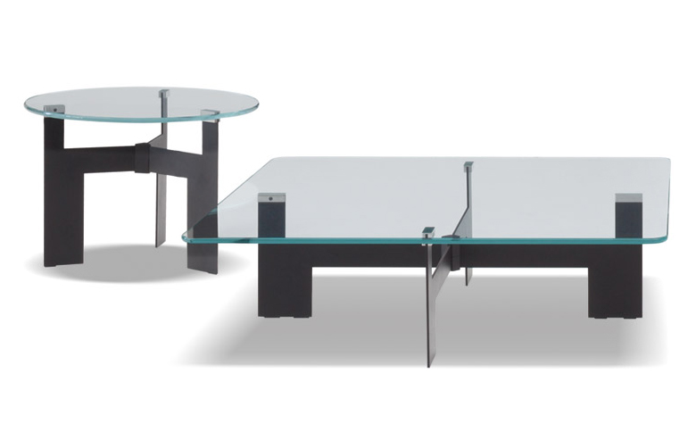 The tops in extra-clear glass or Smoked Grey glass with rounded edge draw attention to the design of the metal base with embossed Black painted finish.