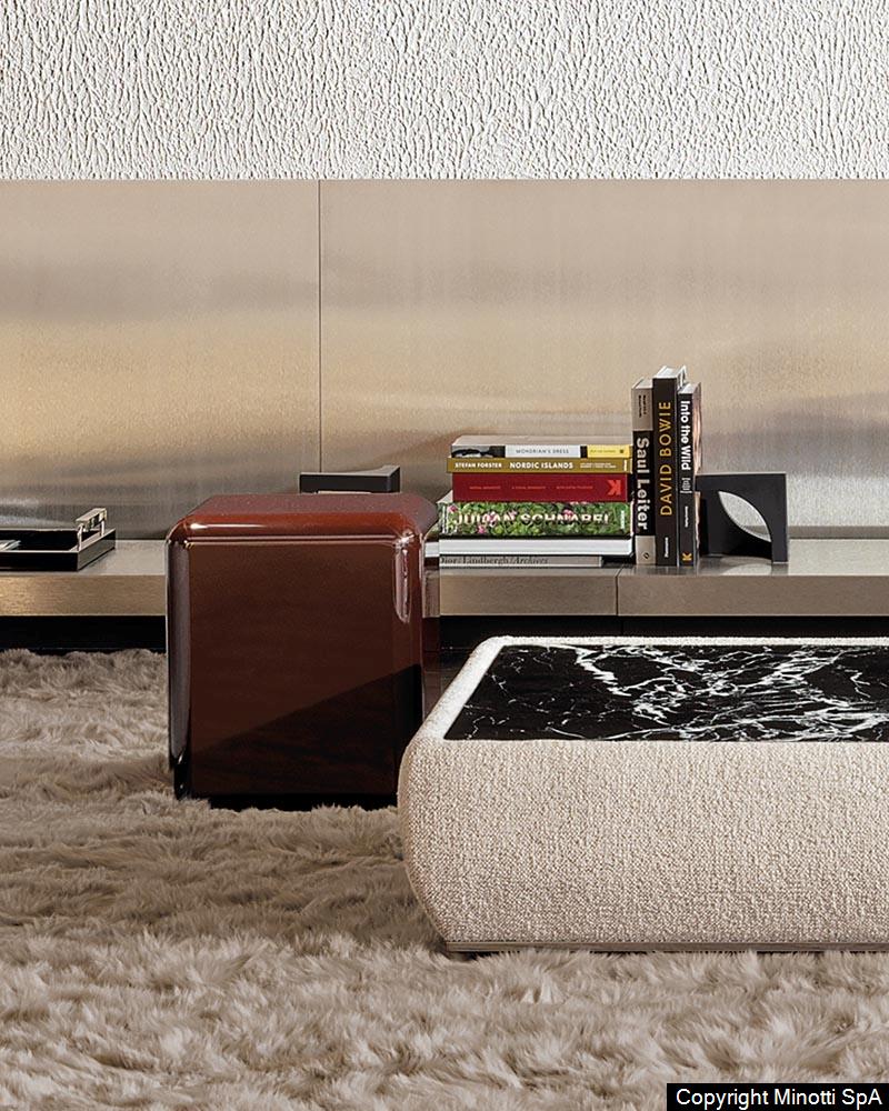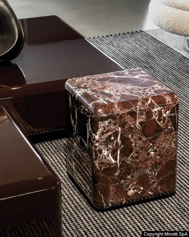 A family of coffee tables with compact, polished geometries that stand out as single volumes, either lacquered or in marble, characterised by the total absence of edges.