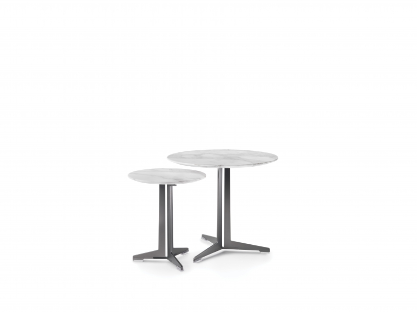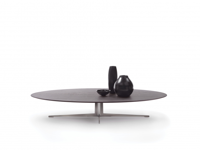 An extensive family of extremely versatile tables, coffee tables, side tables and cabinets, Fly is a genuine expression of the kind of “good design” upon which the entire Flexform collection is built. Purity of design, along with amazing practicality and the variety of finishes and sizes available, make Fly products synonymous with extreme versatility. The unique metal base of the Fly tables comes in chrome, burnished, black chrome or champagne finish, while the top – available in round, oval, square and rectangular shapes, in a number of different sizes – comes in Canaletto walnut or ash, stained in a number of shades, or in various types of marble.