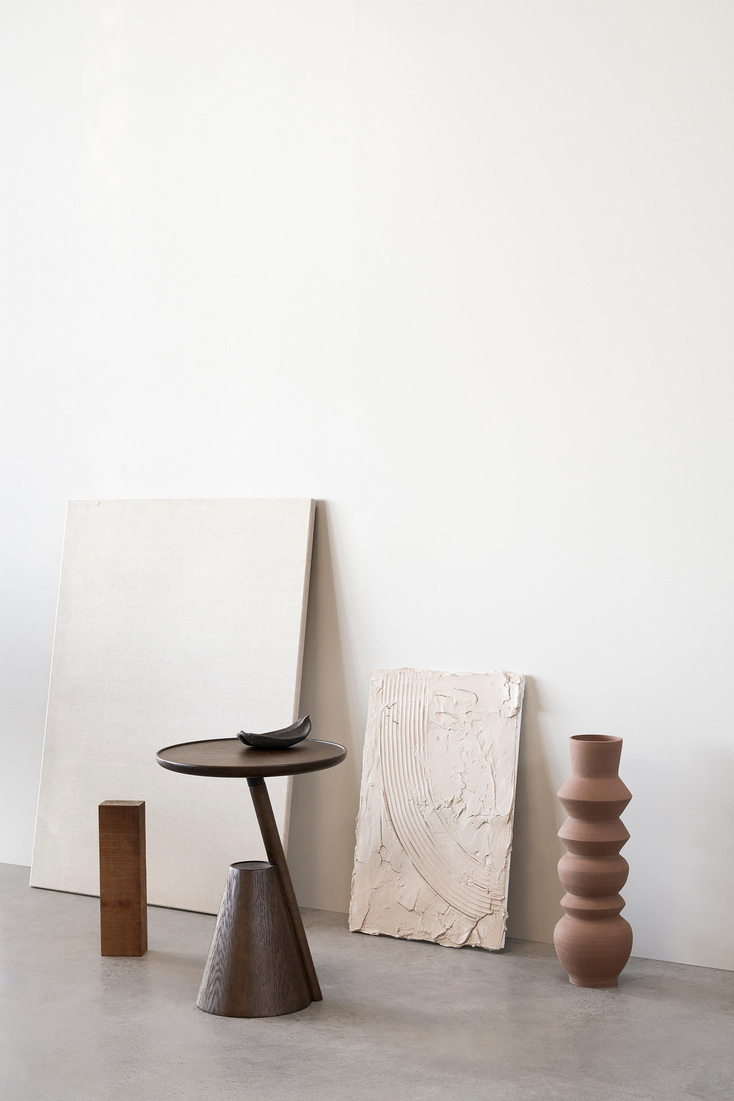Having approached the design from a symbolic perspective, the tray is seemingly floating atop the sculptural base, making it an elegant side table in lounge settings, reading corners and hospitality areas.