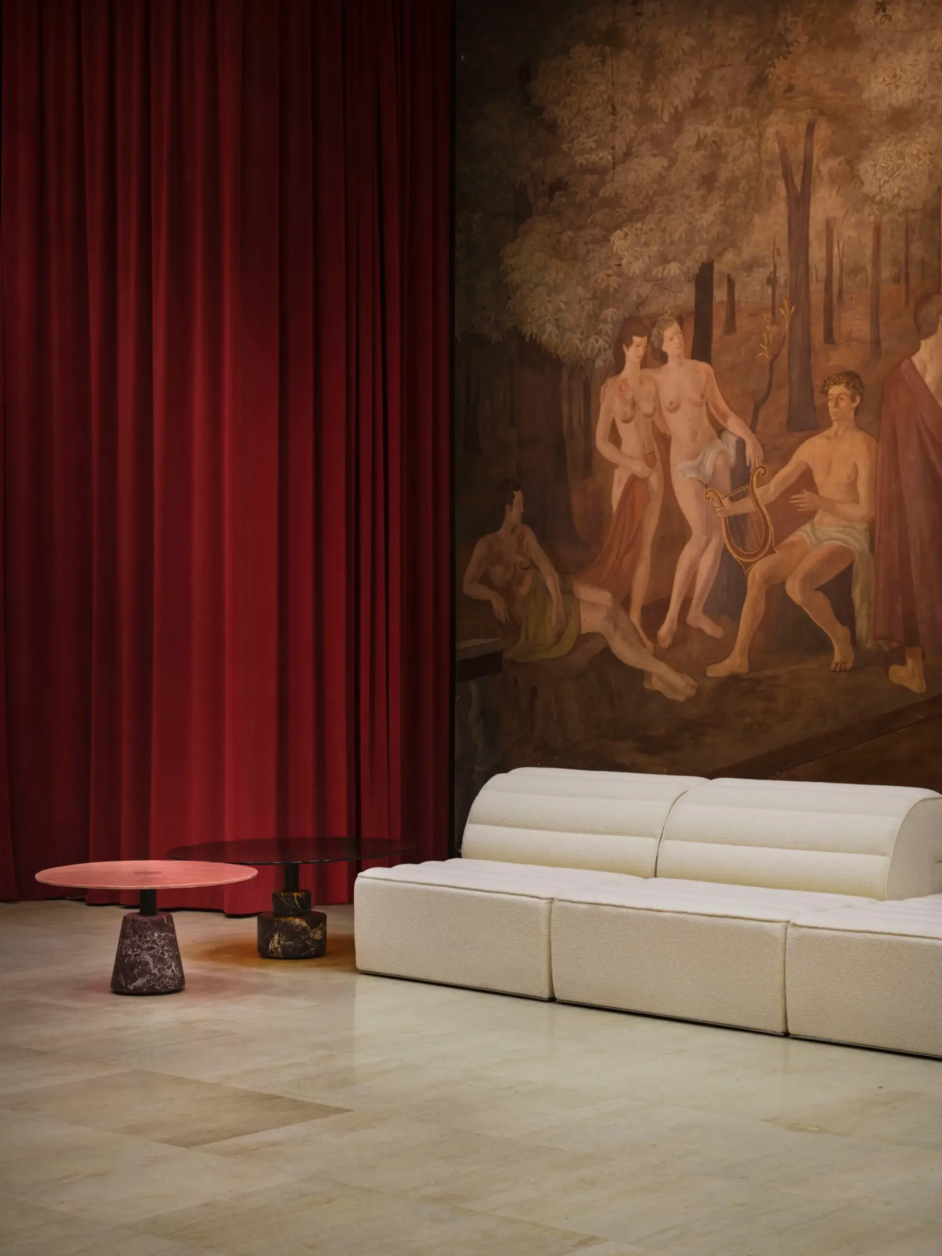 The current version maintains the drums’ shape but has more contemporary finishes, with matt marble, cast glass and new lacquered tops in colours that recall the gritty imagination of the late 60s and evoke the company’s heritage.