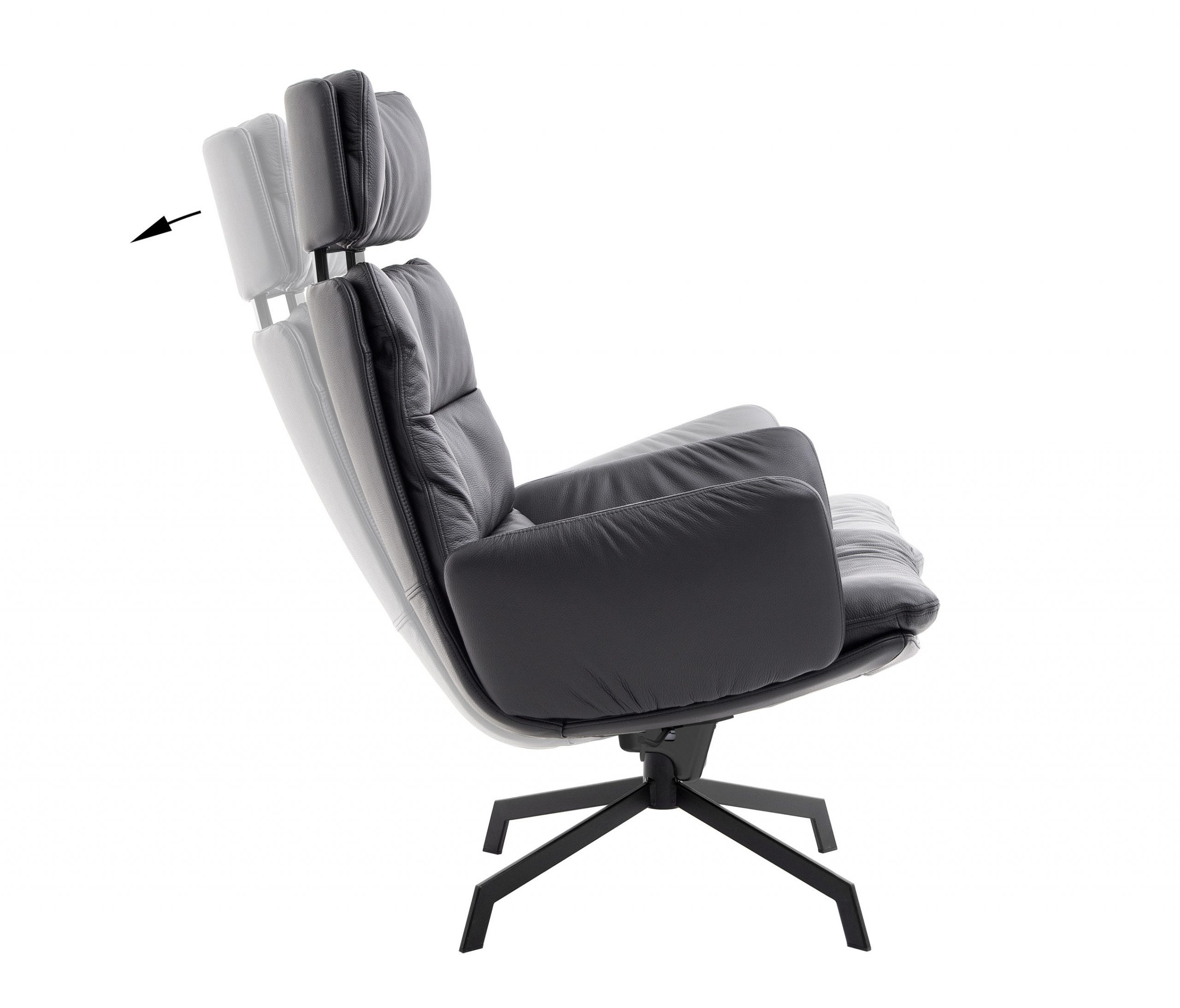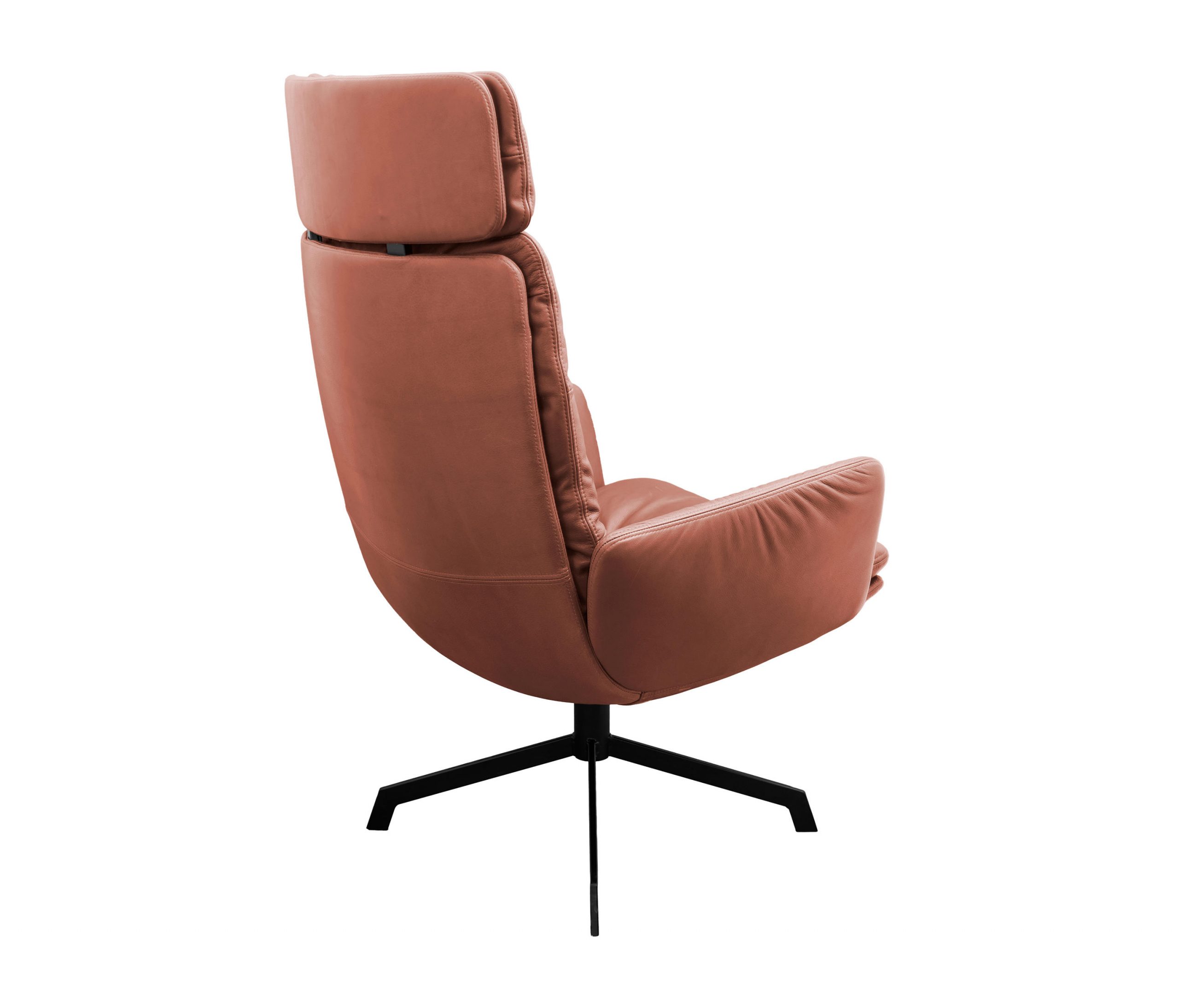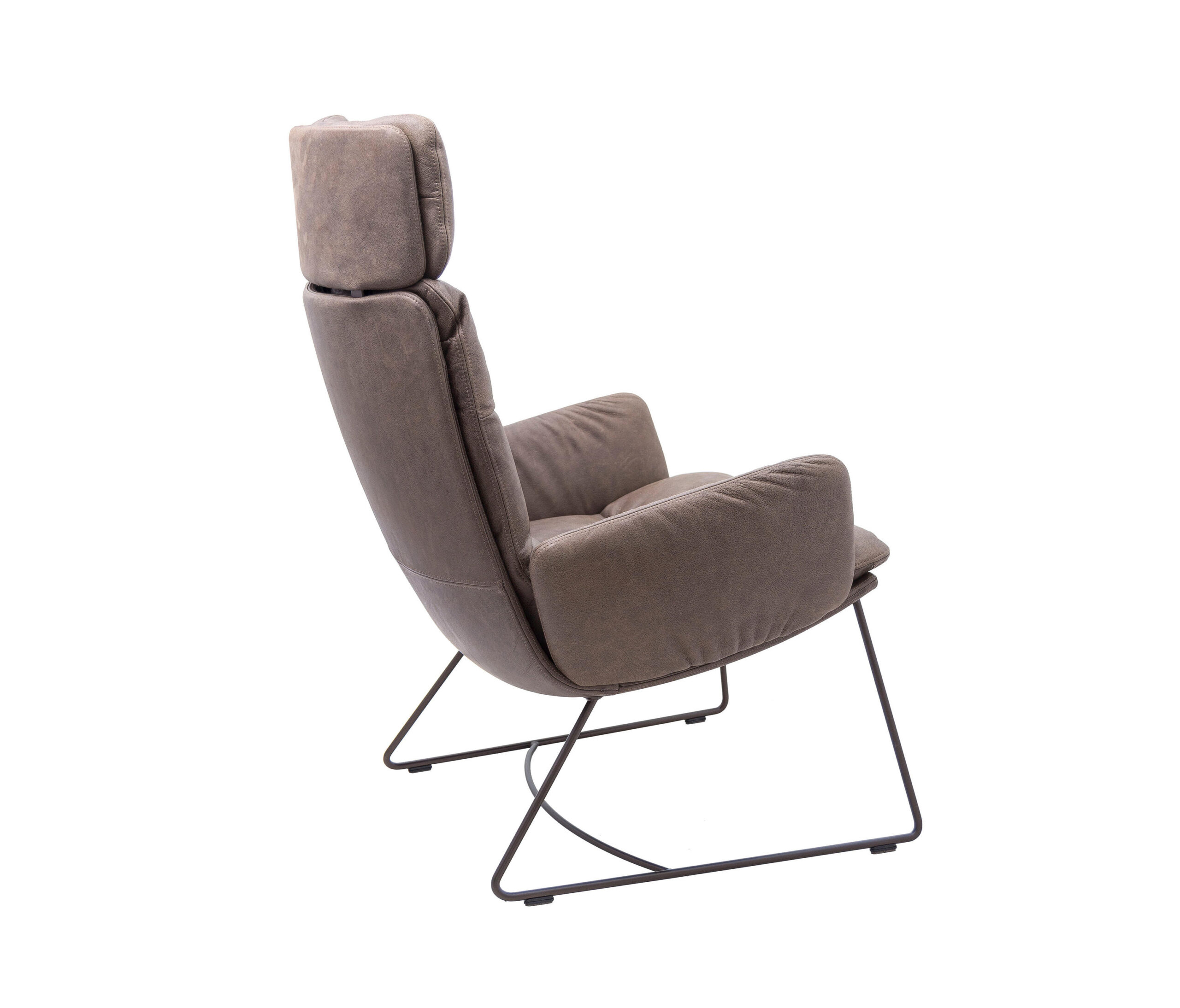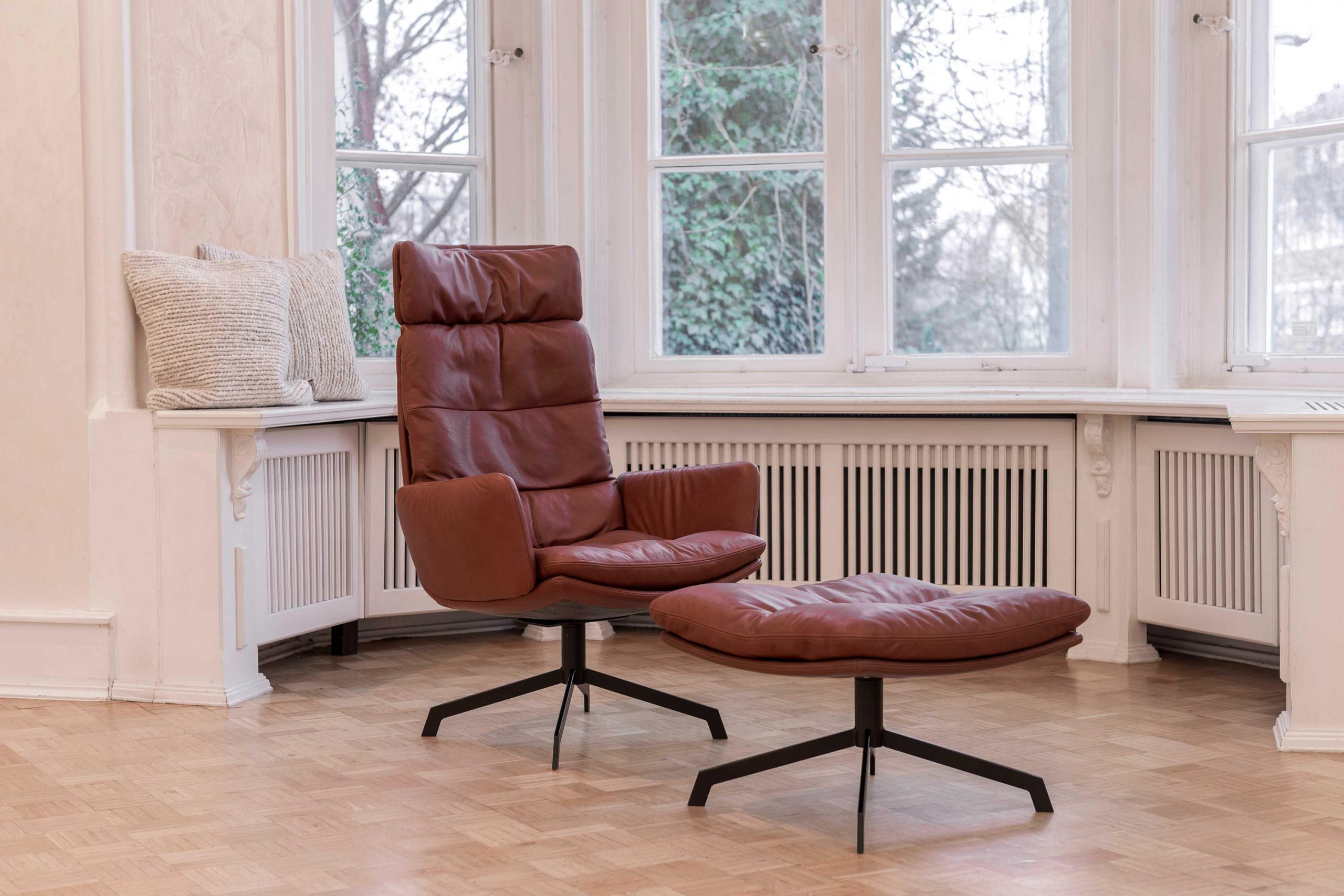 The renaissance of mid-century seating. The ARVA LOUNGE easy chair originates from an idea of Managing Director, Jens Lewe. This reinterpretation won the German Design Award 2018 and has been given an optional rocker function at imm for even more individual comfort. The easy chair — which is available in various designs, as is usual for KFF — rests on a wire skid or swivel 4-leg star frame. Its plywood shell is covered with high-quality leather or fabric and easily accommodates the pocketed, upholstered cushion. The optional armrests and adjustable headrests are covered in the same material as the shell and create a harmonious and extremely comfortable overall appearance. Alongside the ARVA easy chair, KFF is showcasing the ottoman designed for each frame, as well as a side table made from smoked glass, whose matching 4-leg star frame creates a balanced composition, together with the easy chair and ottoman.