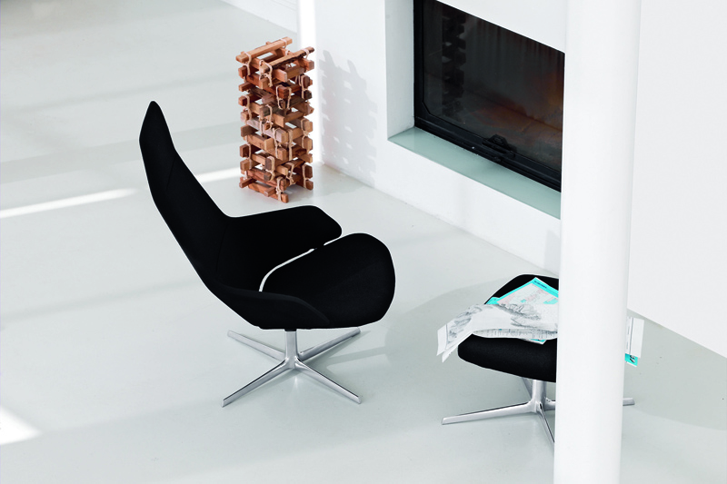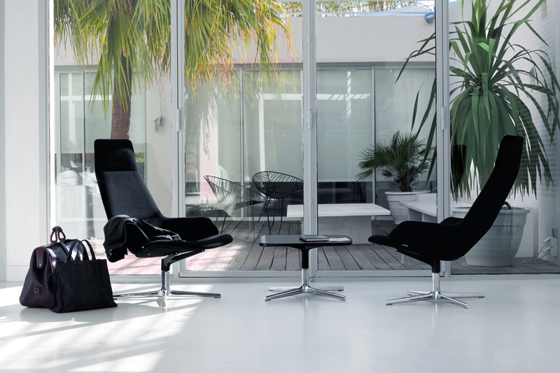 Lounge armchair with four way swivel base in polished aluminium, also available with return mechanism (Art. 1921). The shell support is available with a polished or painted finish. The spring providing the tilt movement is available in chromed or red version. The polyurethane shell is upholstered in leather, faux leather, fabric, or customer’s fabric. Strong and decisive, Aston sits at the head of the table. Defying the conventions of the typical boardroom chair or executive lounge, its linear profile and aerodynamic lines are engineered for comfort and performance. With mechanics sheathed in its sleek form, Aston is ergonomic yet light, making it perfect for both home and work. Especially designed for work environments and applications, Aston is available in three different back heights – Conference, Office and Direction – covered in leather or fabric in a wide range of colors.