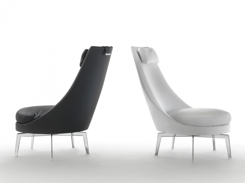 A seating collection with a thousand faces. With or without armrests, more or less upholstered, with high or low backs, structure in wood or metal, swivel or fixed, covered in leather or fabric. Also in the characteristic bean-shaped settee version. A synthesis of elegance and quality, built for everyday wear and tear, and very user-friendly, the GUSCIO collection reaches new heights of versatility, in a truly wide range of models: GUSCIO, GUSCIOALTO, GUSCIOALTO SOFT, GUSCIOALTO LIGHT, GUSCIO SOFT. The version with chassis covered in leather and upholstery in cashmere is extremely elegant. A chic accessory: the headrest cushion fastened with a counterweight to the high back. A stylistic detail that makes the difference.