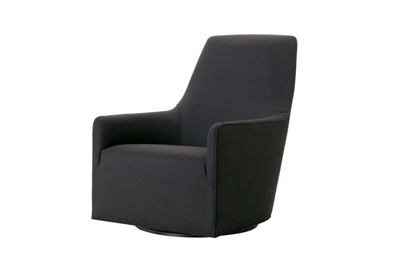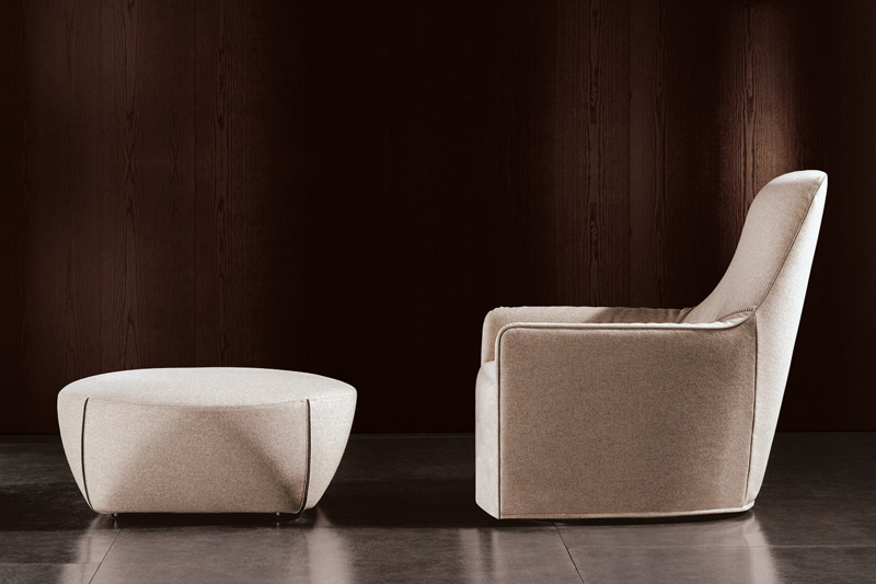 The Portofino armchair is composed by a metal frame, woven elastic straps with a high rubber content, cover, available in removable fabric or fixed leaher, realized with fabric or leather piping, and two different kind of base to choose: swivel or fixed base.