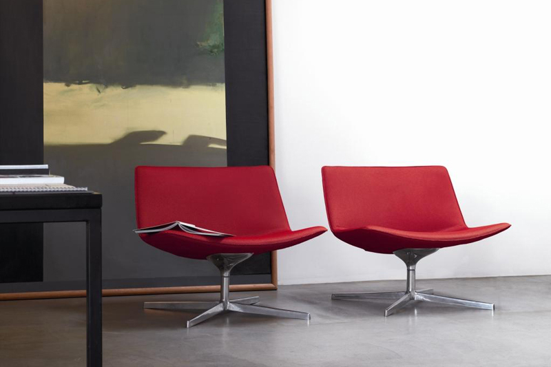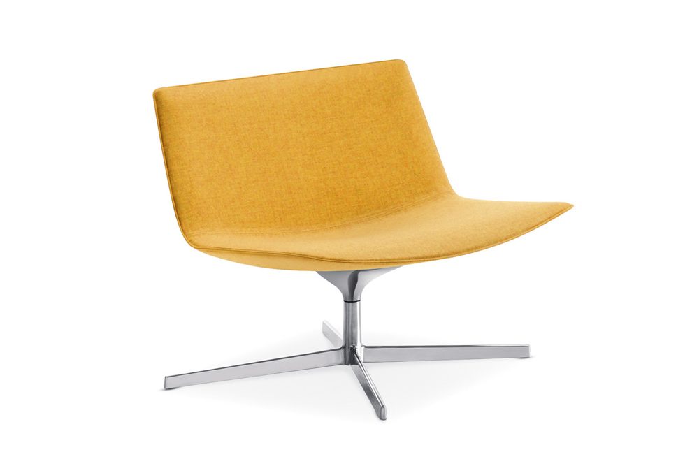Lounge chair with four way base in polished aluminum, available in the swivel version (Art. 2009) or with return mechanism (Art. 2028). The polyurethane shell is upholstered in leather, faux leather, fabric or customer’s fabric.