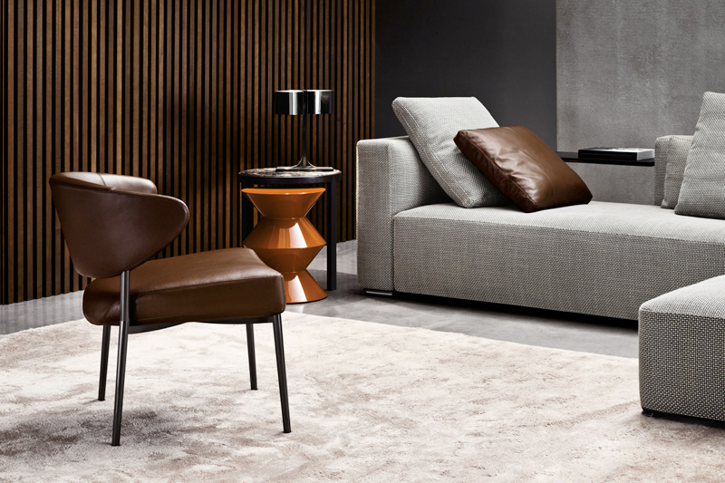 Mills Low armchair by Minotti has delicate dimensions; its profile is dynamic. It comes with a metal seat and a fabric or leather upholstery. The cover is removable only in the fabric version.