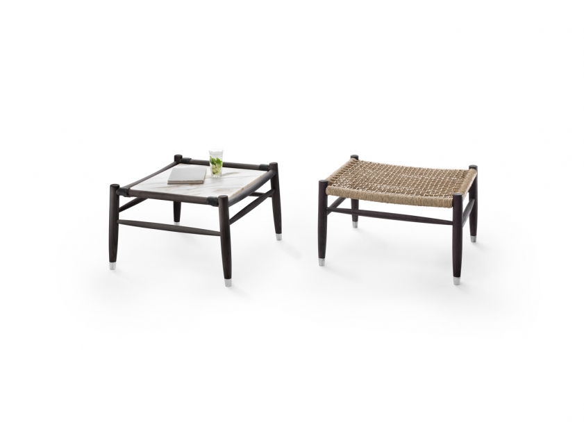 The Tessa family includes an armchair, ottoman, bench and a coffee table with marble top, available in a number of types of marble.