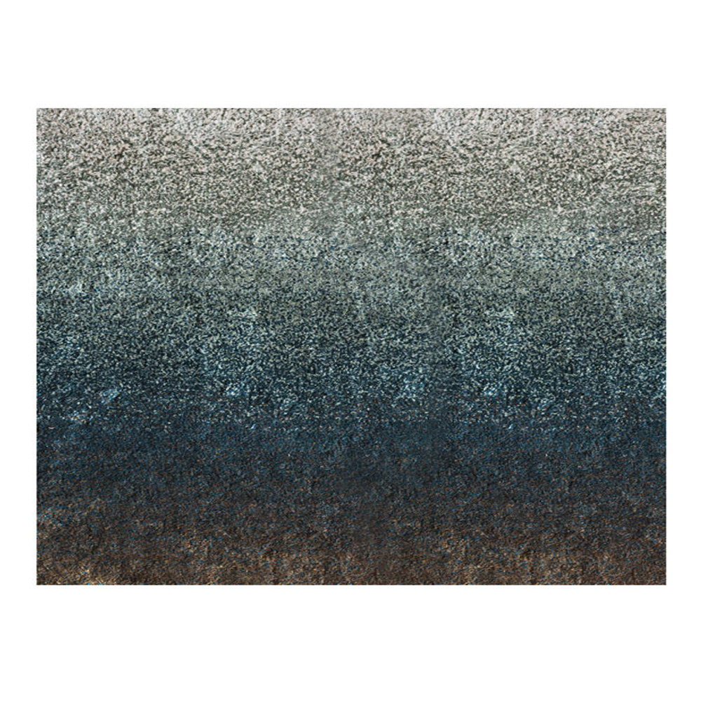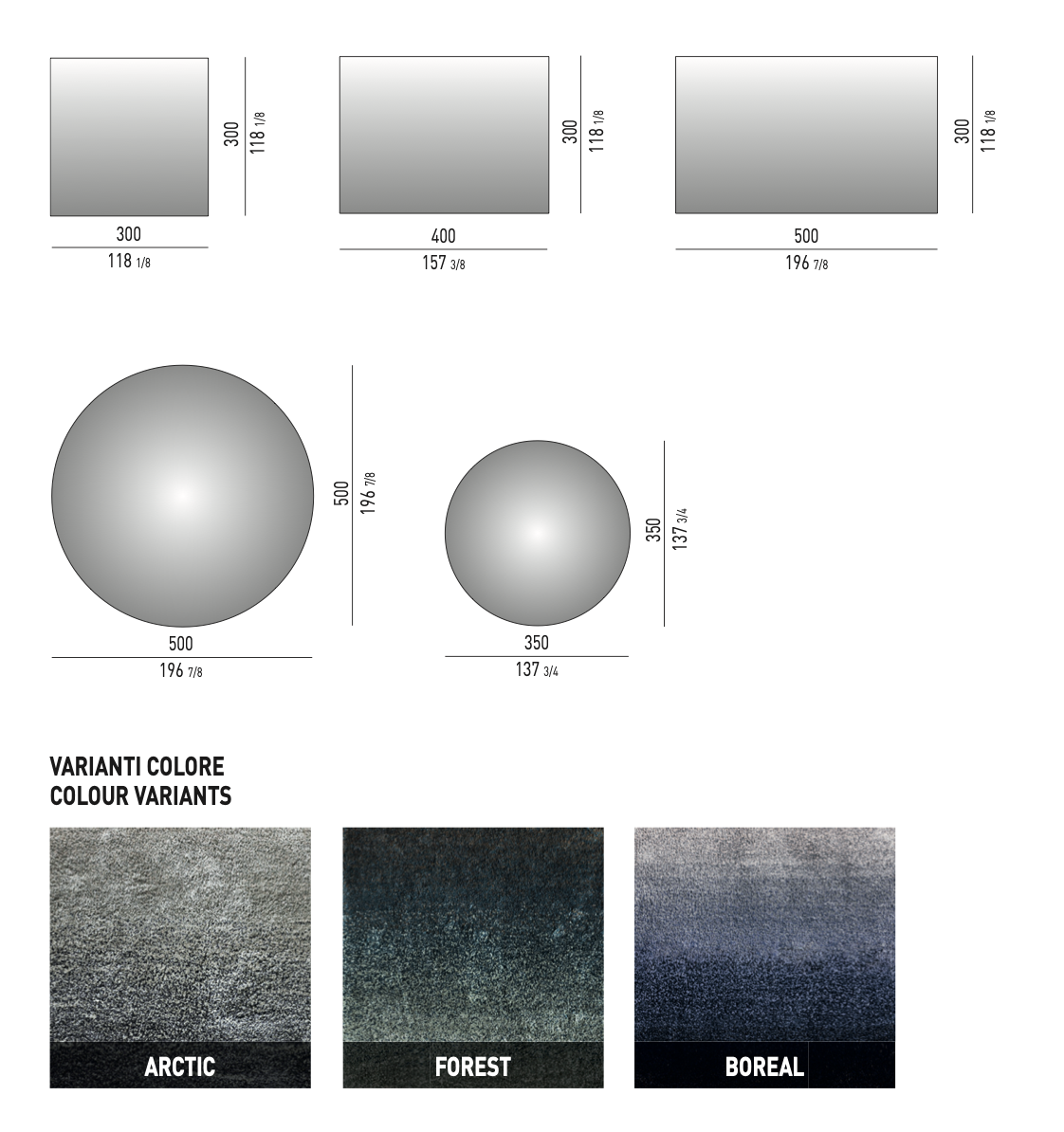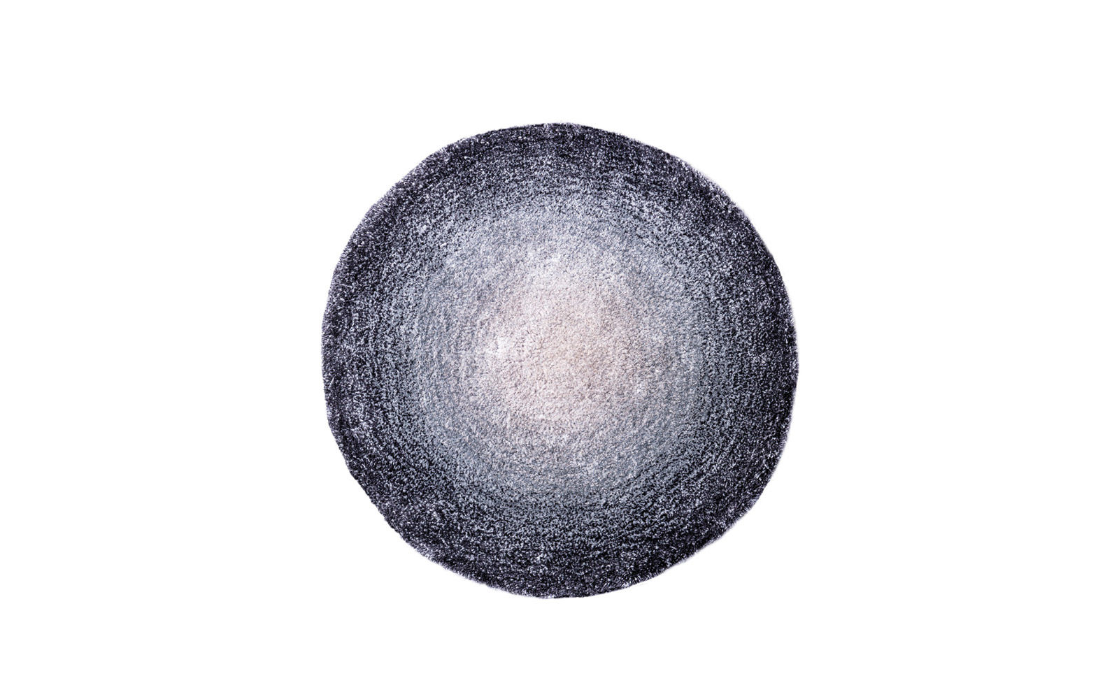 Rug made from 100% Lyocell® (a cellulose fibre), hand-crafted according to the manual Tufting method. The surface, 16 mm in thickness, made of shorn viscose (Lyocell®), produces bright, iridescent reflections. The upper layer is made of polyester; whereas the lower layer is treated with natural, prevulcanized, antiallergenic latex. Overall weight: 5.5kg/m2.The Rainbow patternis the result of a degradè shading obtained mixing different colors, developped on the shorter side of the rug. In the sizes Ø 350 cm and Ø 500 cm the degradé effect deve- lops from the centre, which is lighter, to the external part, which is darker.