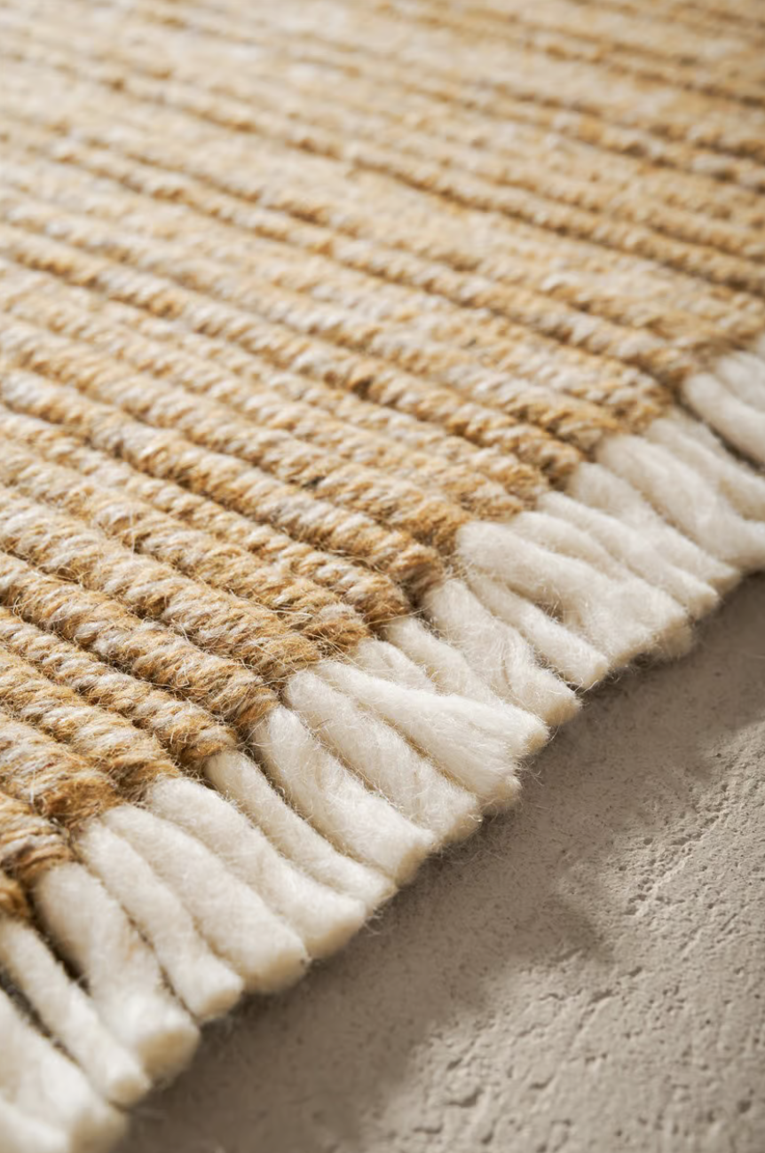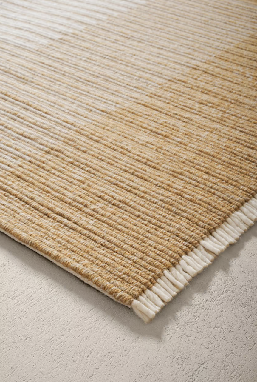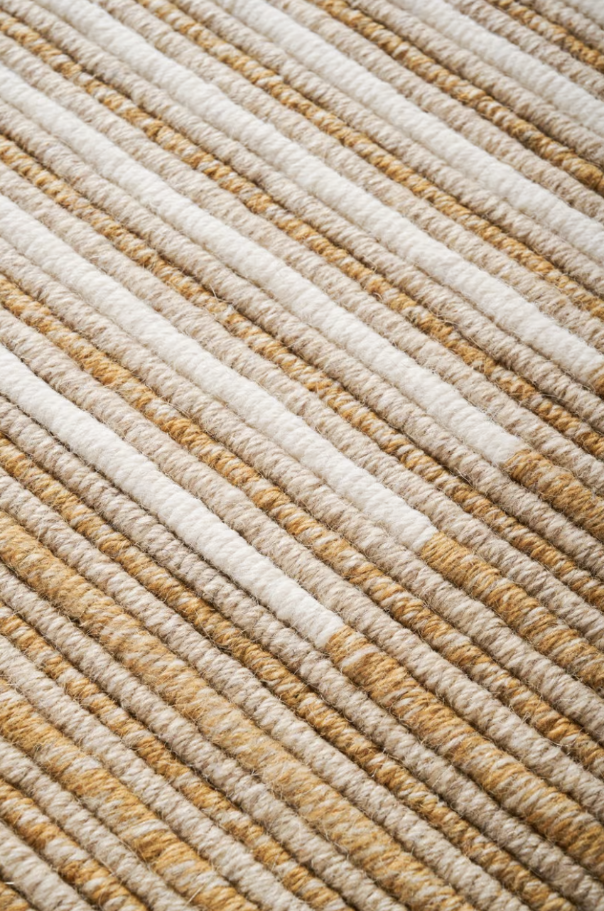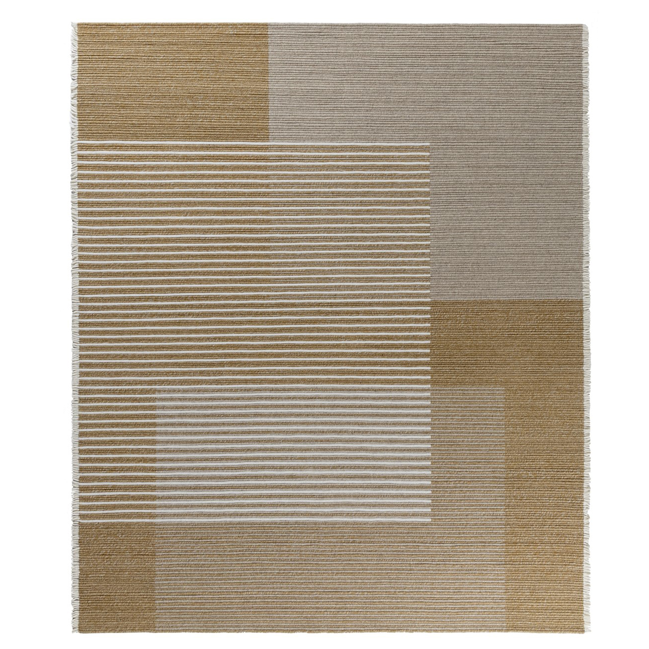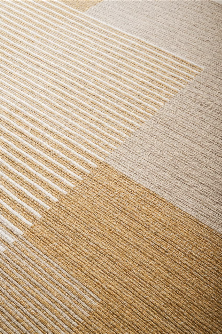 Thick felt yarns, onto which thinner threads are wound, give life to a rectangular shape that repeats itself in a visual crescendo, acquiring ever greater consistency and gradually materialising. The result is a play of overlaps that recalls Rodolfo Dordoni’s typical geometric rigour, enhanced here by a dynamic composition. The design originates from the warp, while the weft remains almost hidden – visible only at the sides – adding depth and mystery to the entire composition.