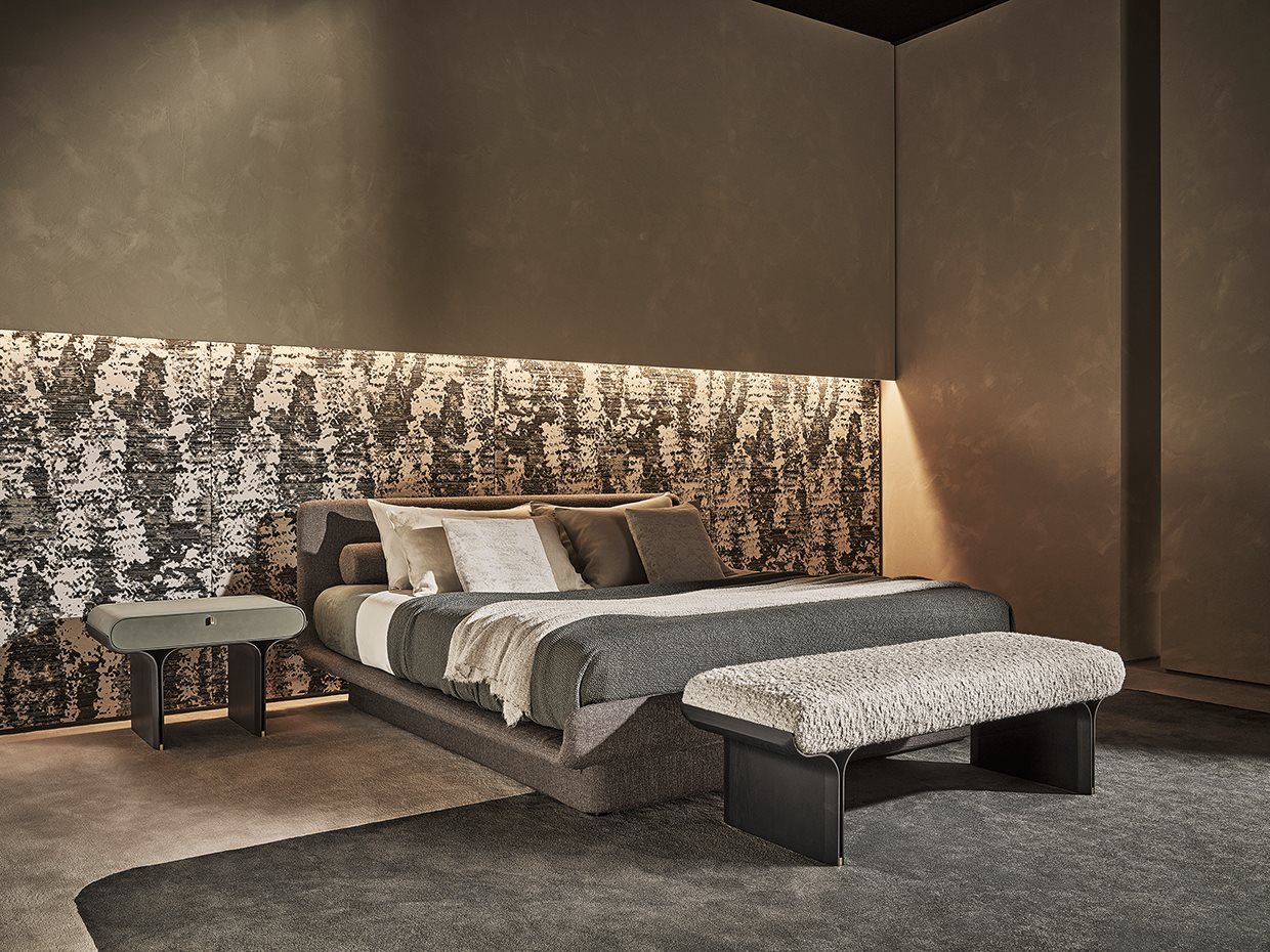Bench with curved black open pore stained ash base and bright brass details. Also available opaque lacquered wooden version in the colours "Bianco Camargue", "Sabbia del Nilo, "Rosa Jaipur", “Rosso Persia”, "Bordeaux Etruria", "Verde Provenza", "Blu Pacifico", “Grigio Londra”, “Nero Giza”. Cushion in polyurethane foam covered by fabric or leather as per samples. Removable cover. Additional stitching is required for elements with leather upholstery compared to elements with fabric upholstery.