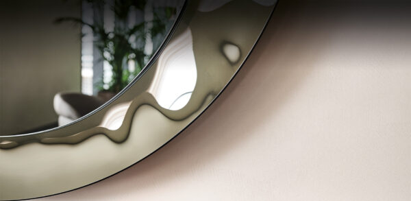 Cosmos is made up of two distinct elements. The mirrored central portion with irregular contours seems to be designed freehand and instinctively, with the greatest naturalness; while the outer edge, positioned on an underlying level, is slightly concave. The surface does not reflect the environment sharply, but by exploiting the brightness of its surroundings it acts as a decorative frame with a liquid and changing optical effect.