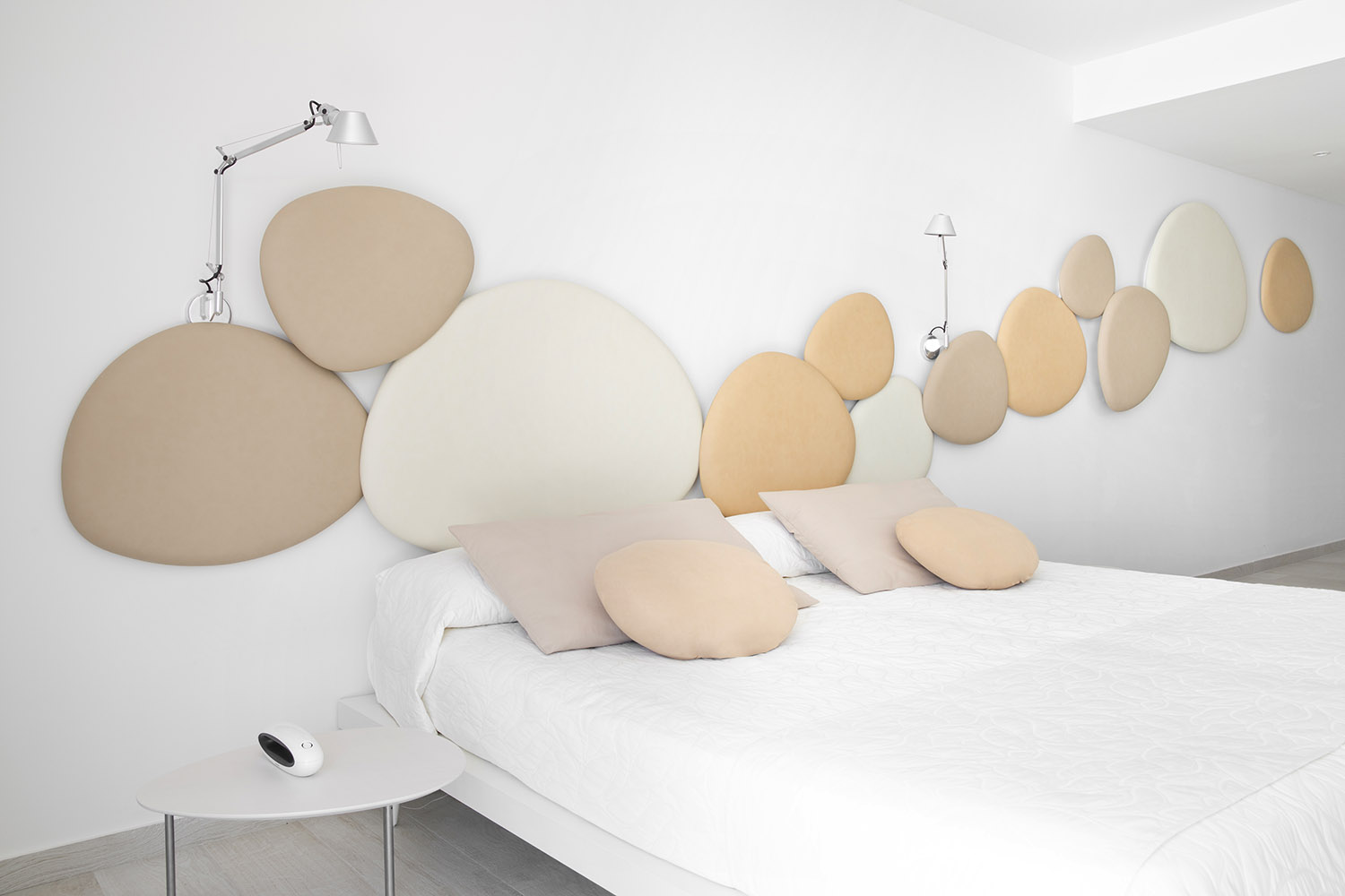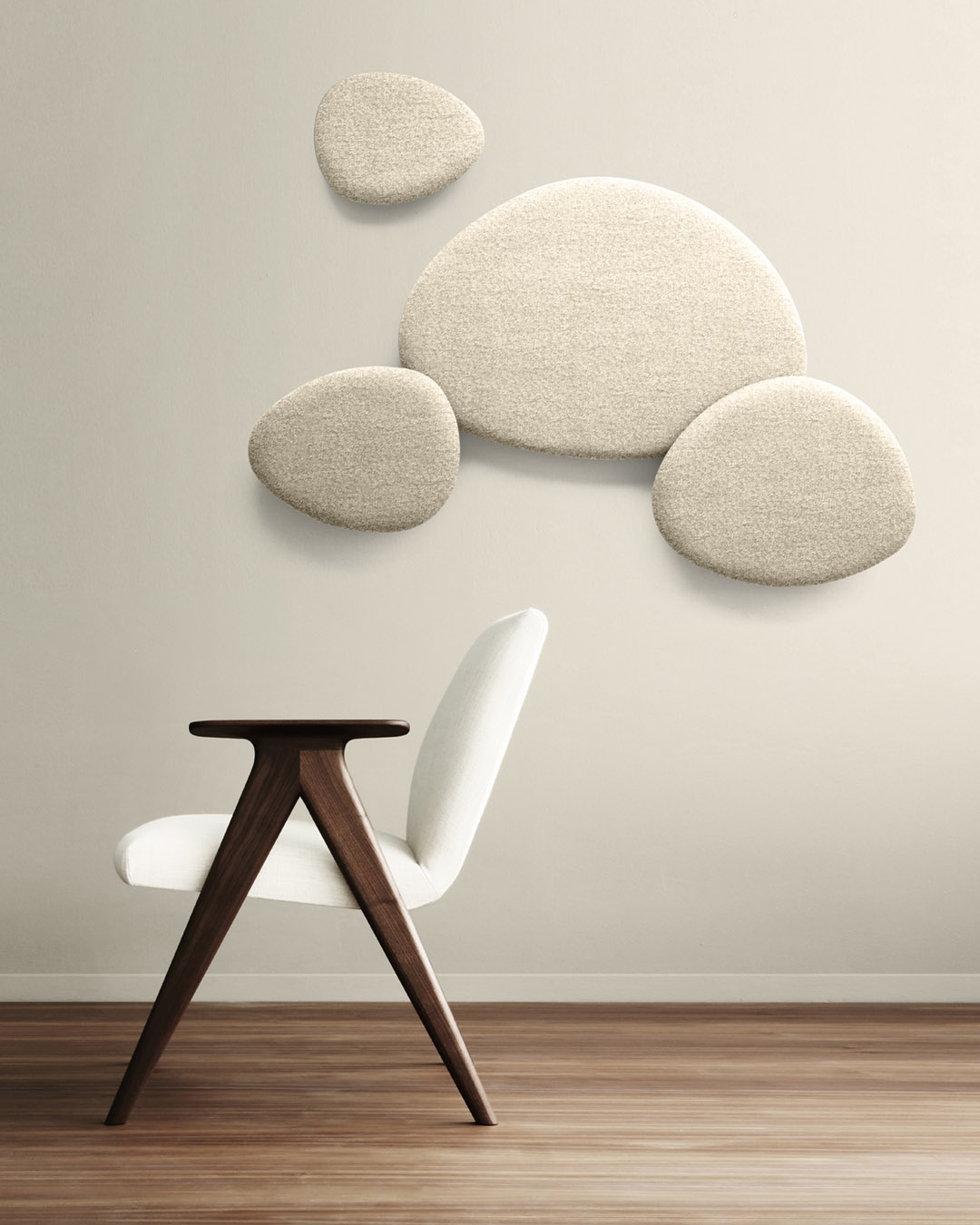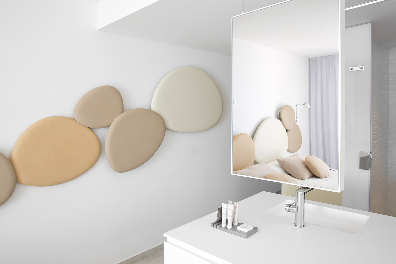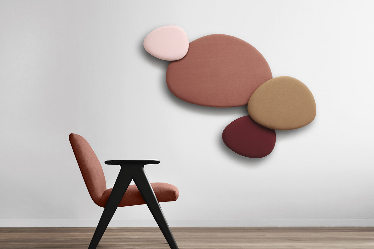 Satellite is a decorative acoustic panel system for the wall, created with the aim to absorb noise. Satellite panels have the same organic shapes as the Eclipse tables, coming in four different sizes and shapes. Satellite panels are fixed to the wall at two dif- ferent depths, in order to play with the shapes and conceal them under each other. This allows fur- ther creativity when arranging the panel’s configuration on the wall. The acoustic panels are made with noise-reduction foam cladded onto a wooden board and covered with fabrics from the STUA col- lection. Satellite panels help to absorb sounds and reduce noise in a room. The combination of panels and shapes allows interior designers great freedom to create numerous configurations. And there are even more possibilities with the wide range of materials and colors, from soft to flashy. The Satellite panels come with an easy suspension system that also allows the panels to rotate once fixed. This makes it easier to cre- ate interesting configurations. The Satellite panels are sold in sets of 4 units, one of each size: Small, Medium, Large & Extra Large in the same fabric.