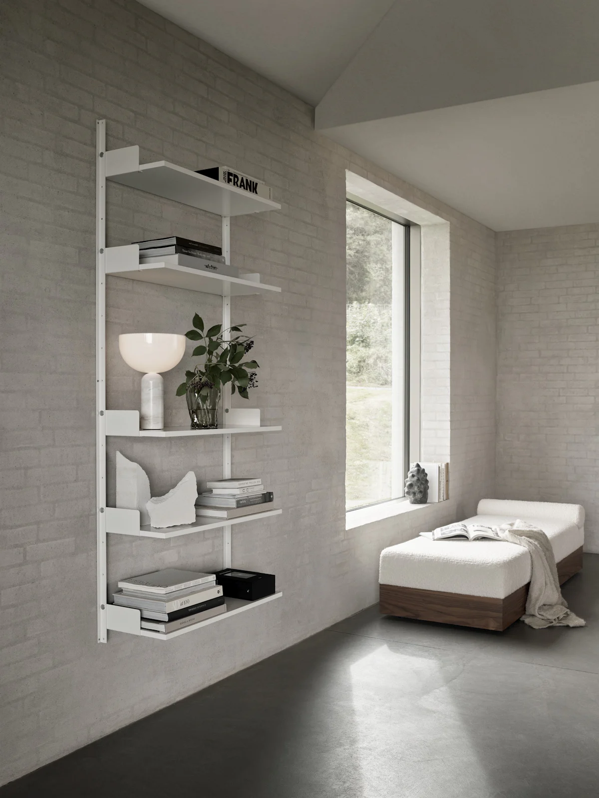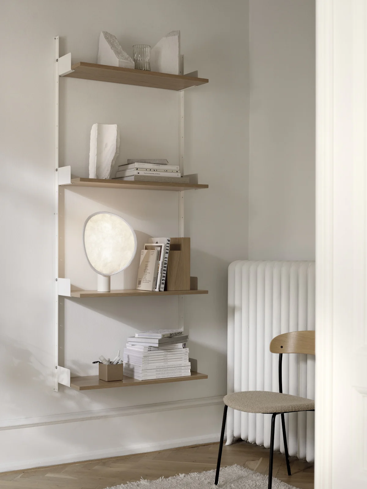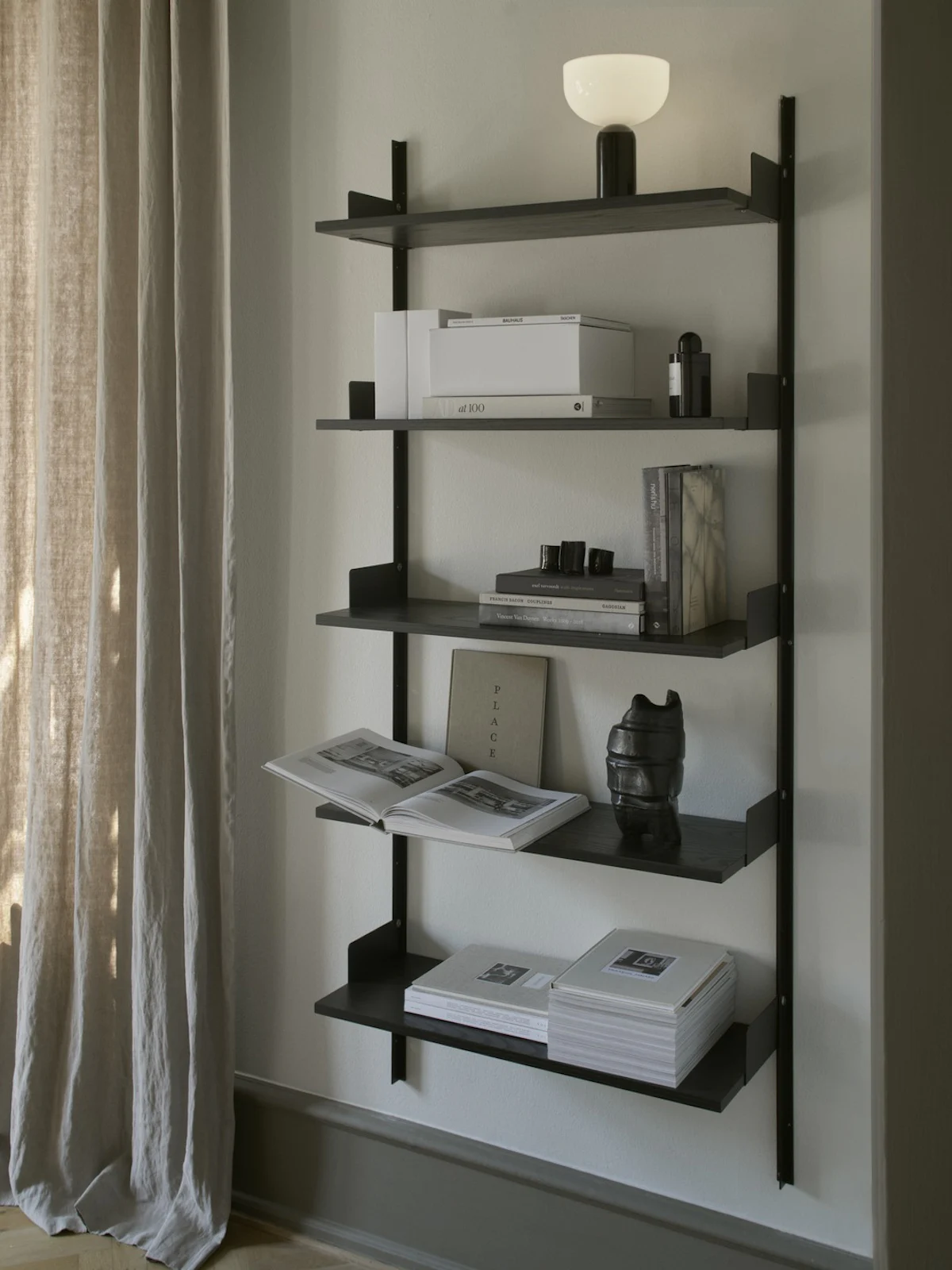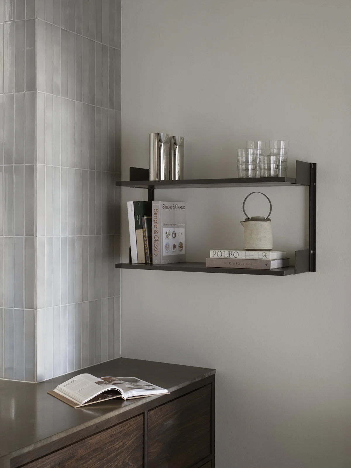 Sometimes the simplest pieces prove to be the most difficult to find, say, the quintessential wall shelf. With understated details and intelligible flexibility, the New Works shelving system aims to be just that. Designed to effortlessly blend into a variety of spaces, this simple shelving system continues New Works’ ongoing quest of creating elevated basics. Nothing is surplus and everything has been carefully attended to, like the angular profiles of the wall bars and the integrated bookends that keep your belongings in place. The shelves are neatly assembled with flat knurled screws in stainless steel, adding an honest yet refined detail to the design. A system that is meant to grow - in your home and in range – to accommodate various storage needs.
