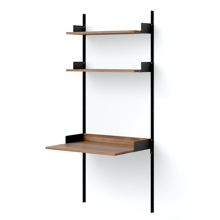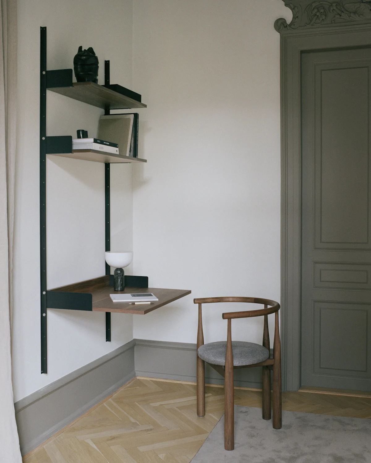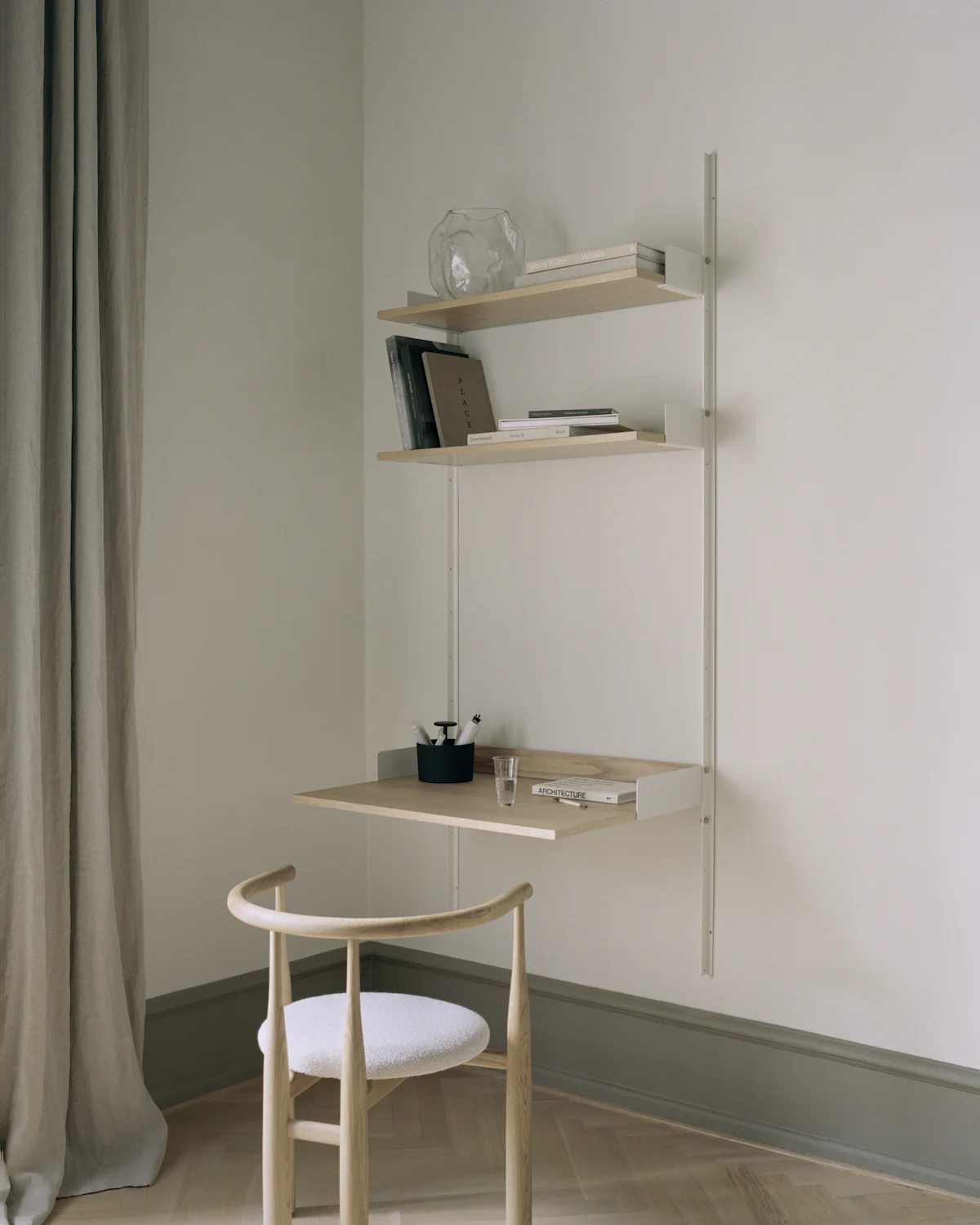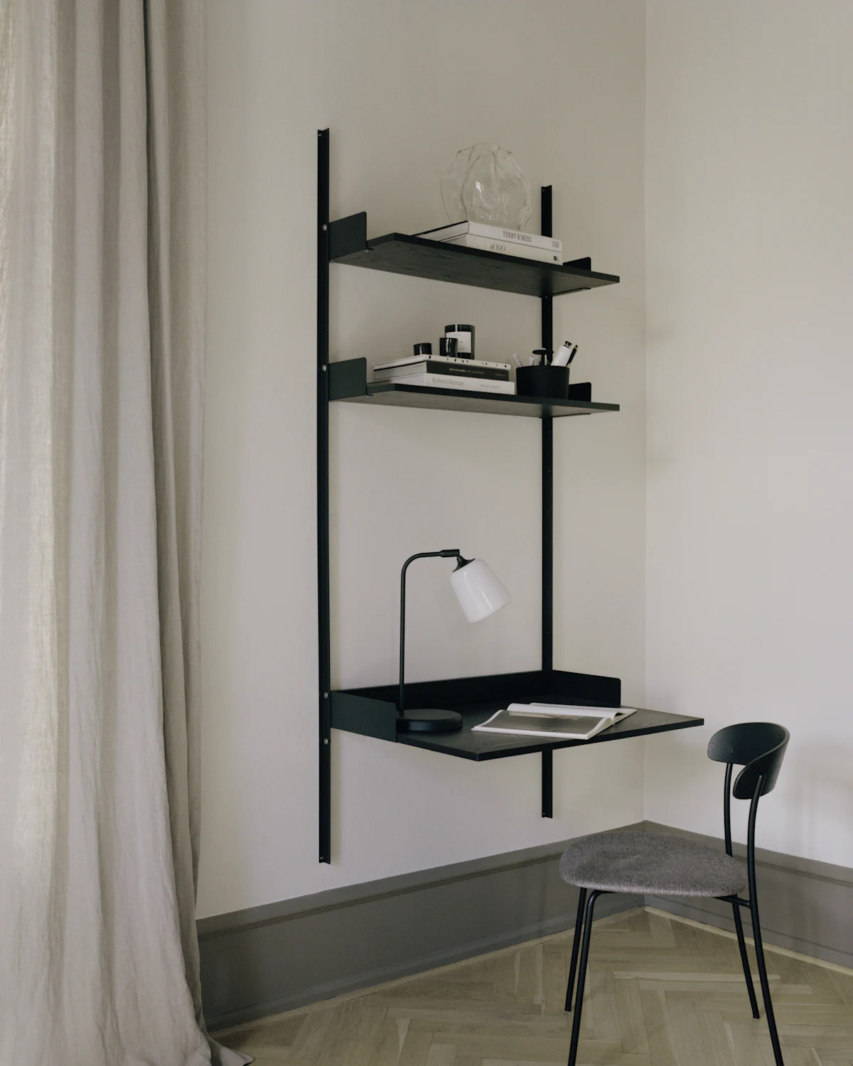 The New Works Study Shelf is ideal for creating a nook for work, homework, drawing or other creative pursuits, wherever in your home you may need it. The New Works Desk follows the design traits of the New Works Standard Shelf with its extended metal supports framing the desk. It features an outlet for cables, which holds them neatly in place and keeps their technical expression away from your home environment.