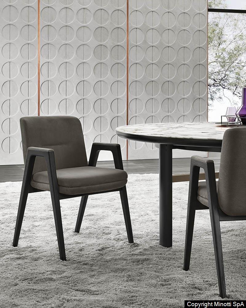 In the version with armrests, the lateral trestle structure rises to design the armrest, which features a refined padded strip covered with Aspen leather that embellishes the wooden structure. While amplifying the overall comfort, this detail is also an expression of the company’s know-how and its care of constructive solutions.