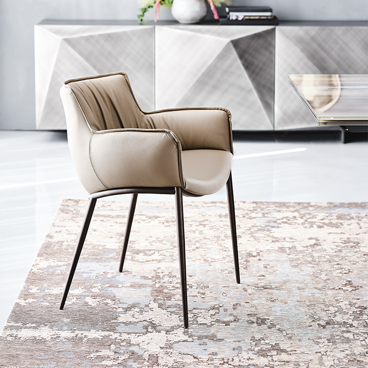 This dining chair with armrests is available in different variants. The Rhonda model with metal legs is lighter and more manoeuvrable than the Rhonda Wood version, with legs made of charming, precious wood essences.