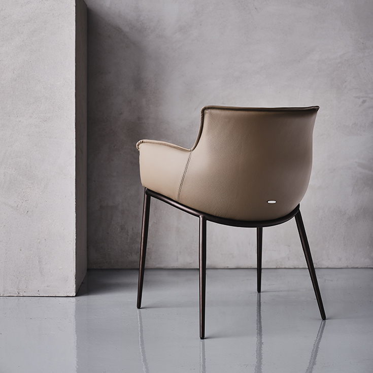 The rounded Rhonda armchair has a natural elegance that makes it perfect for furnishing a comfortable and welcoming design dining room. The soft folds that decorate the inside of the backrest contrast with the stretched frame that wraps around the body.