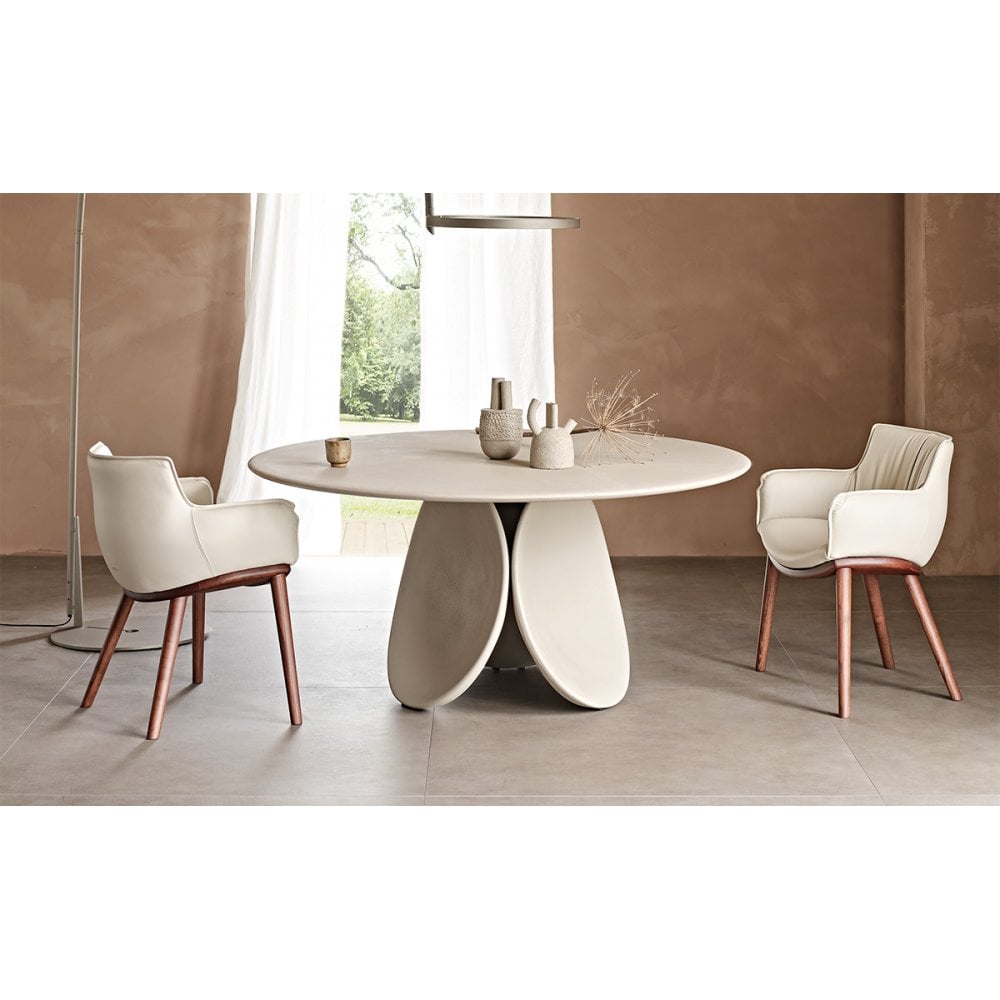 The rounded Rhonda armchair has a natural elegance that makes it perfect for furnishing a comfortable and welcoming design dining room. The soft folds that decorate the inside of the backrest contrast with the stretched frame that wraps around the body.