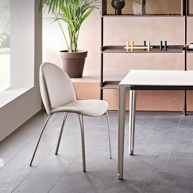 Holly is an elegant design chair with graceful and original details, which delicately completes a modern and cosy dining room. Each element has a soft and rounded line. In particular, the legs are composed of a pair of metal stems, curved outwards and towards each other, which create a delicate tension in the structure. The seat is large, while the compact backrest is designed to give maximum comfort, even with modest dimensions. The curved seam on the back of the backrest highlights the roundness of this modern chair, made with fine materials and superb artisan techniques.