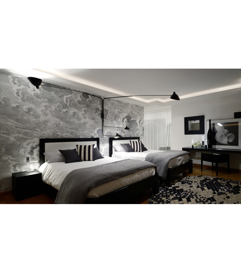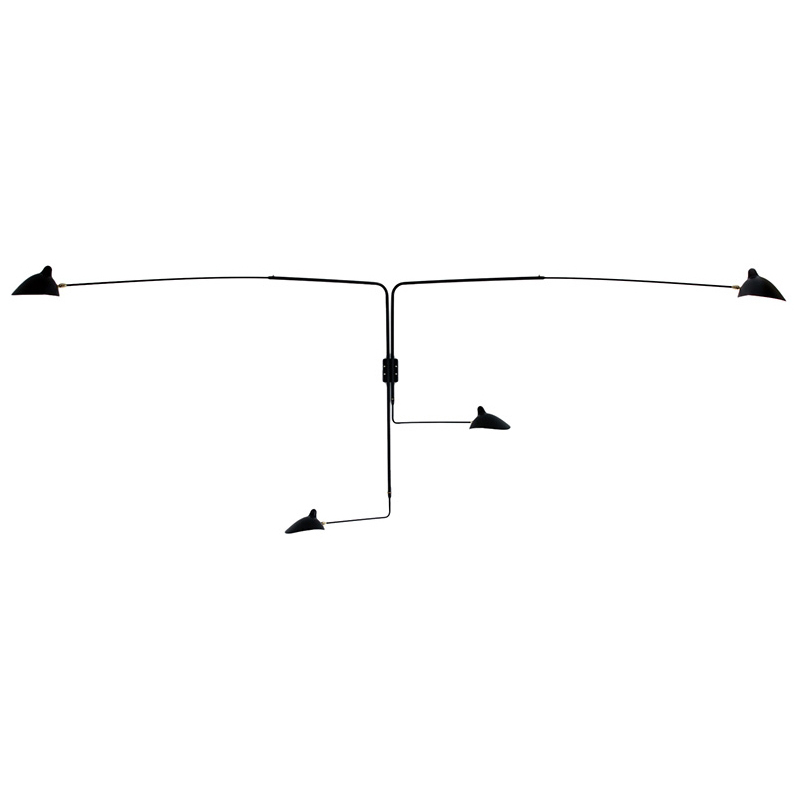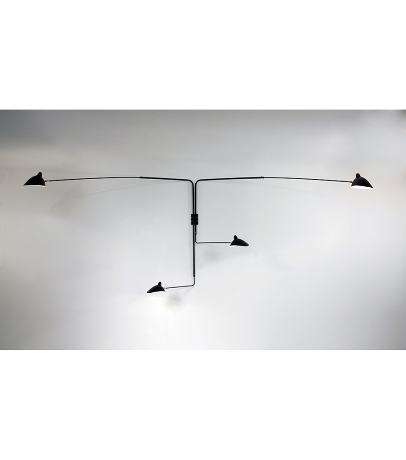 Sconce 4 Rotating Straight Arms designed by Serge Mouille is a wall lamp, the original 1954 model reissue. It have 4 rods steel painted black, the reflectors made of black lacquered aluminum with white interiors, the joints of brass. Light bulbs: E27 4x42W