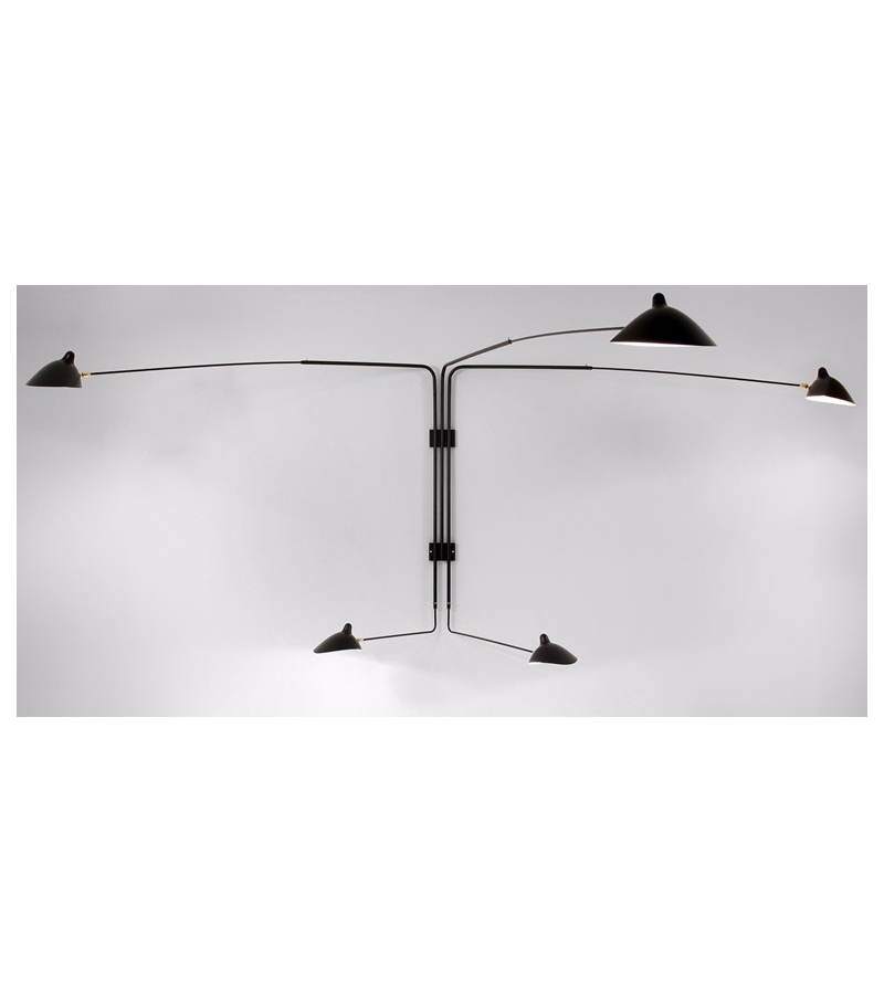 Sconce 5 Rotating Straight Arms designed by Serge Mouille is a wall lamp, the original 1954 model reissue. It have 5 rods steel painted black, the reflectors made of black lacquered aluminum with white interiors, the joints of brass. Light bulbs: E27 5x42W