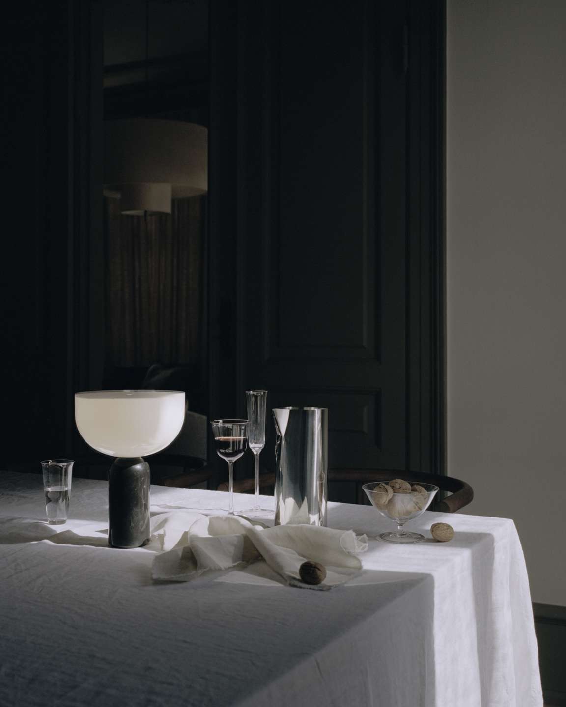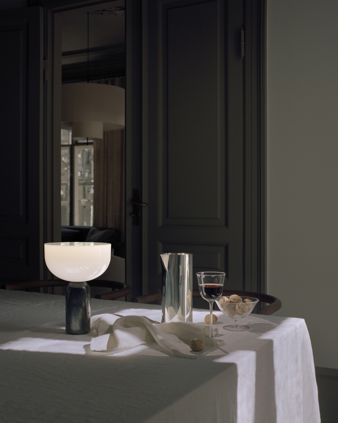Balancing bold forms, the Kizu Table Lamp intrigues the eye with its sculptural composition, and this portable version of the lamp is no exception. Materials and expression are as we know them, but this cordless, smaller size is easy to move around where light is needed. With marble as the bearing element, the lamp obtains natural stability and the polished stone feels comfortable to the touch. As the light spreads from the entire upper part of the lamp, the small table lamp offers a high light output. A turned countersunk metal circle on the top of the lamp adds a refined detail to the design, and by tapping gently on the circle, the light can be dimmed to three different levels. The Kizu Portable Table Lamp has a battery life of 10 hours at a light setting of 100% and is charged with a USB-C cable.