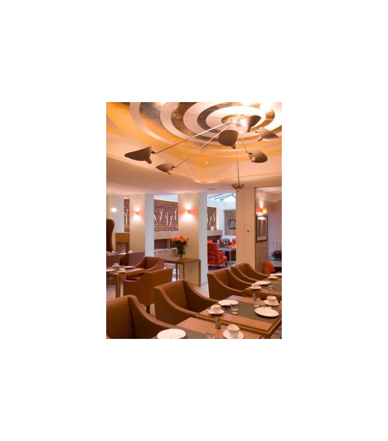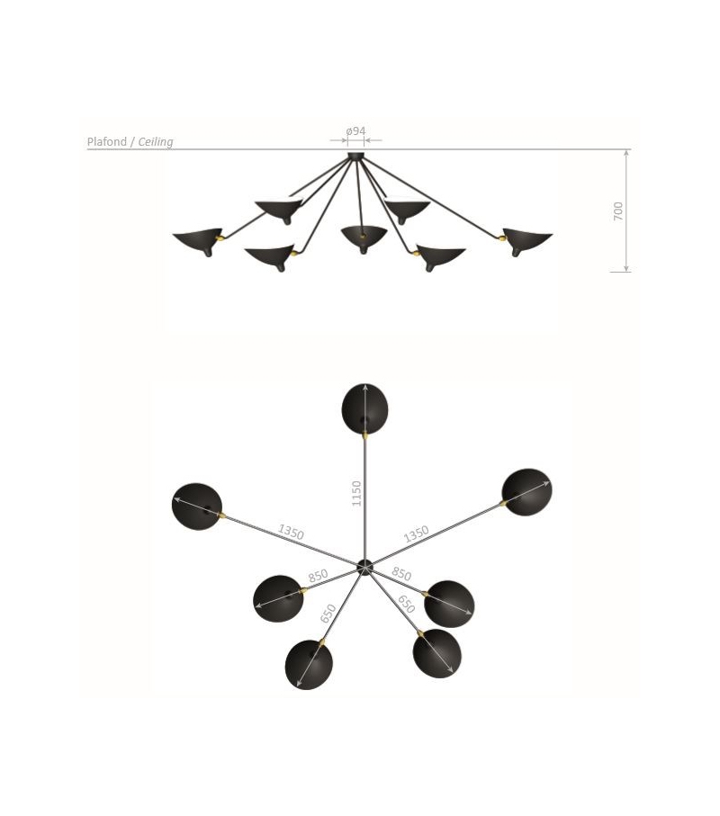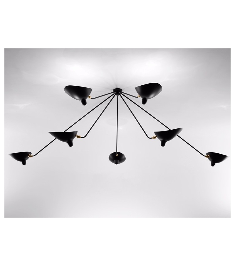 Ceiling Lamp "Spider" 7 Still Arms designed by Serge Mouille is a ceiling lamp, the original 1953 model reissue. It have 7 rods steel painted black, the reflectors made of black lacquered aluminum with white interiors, the joints of brass. Light bulbs: E27 7x42W
