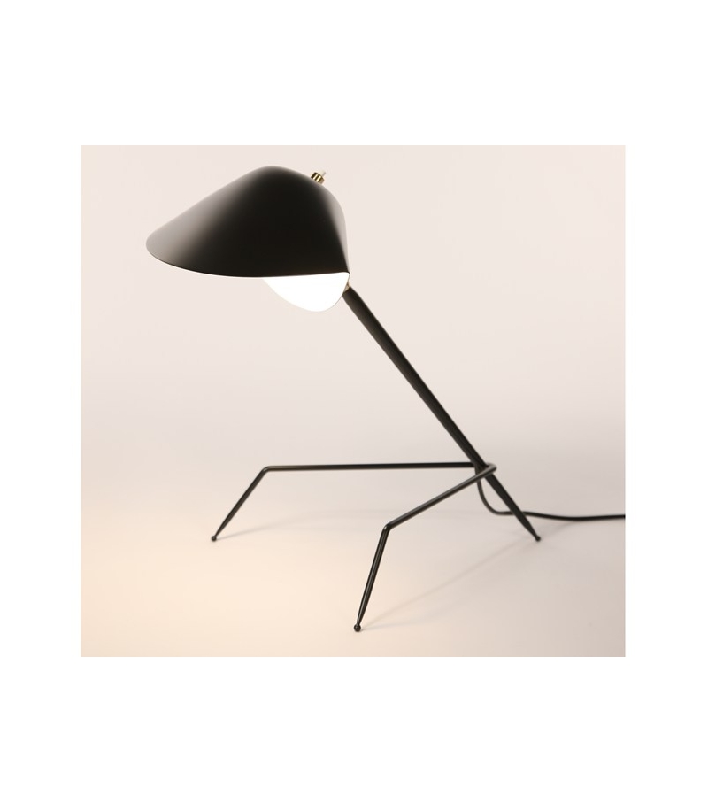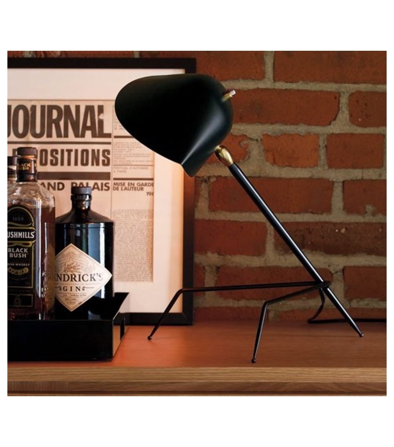 Desk Lamp "Tripod" designed by Serge Mouille is a table lamp, the original 1954 model reissue. It have reflector made of black lacquered aluminum with white interior, the joint of brass. Light bulb: E14 42W